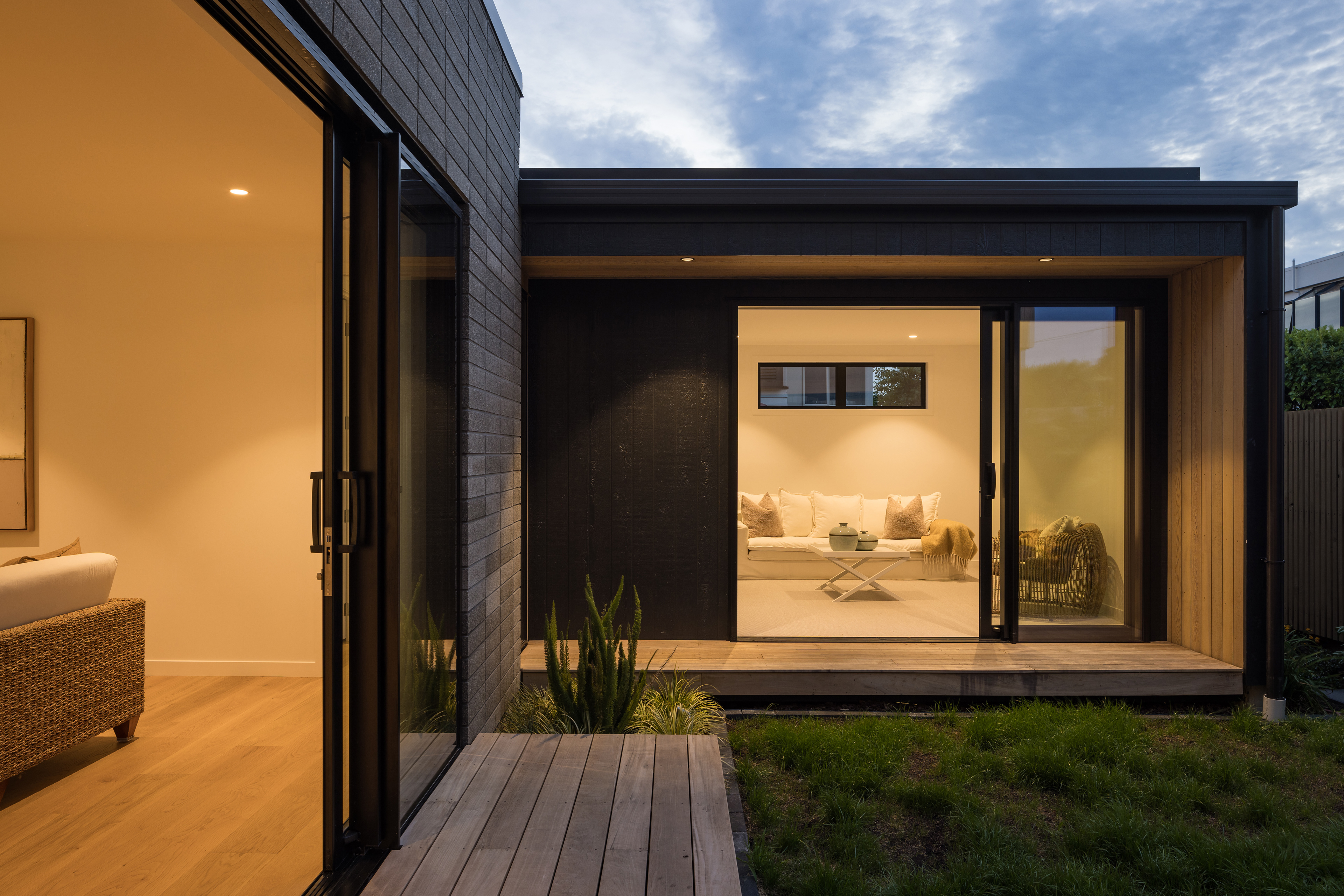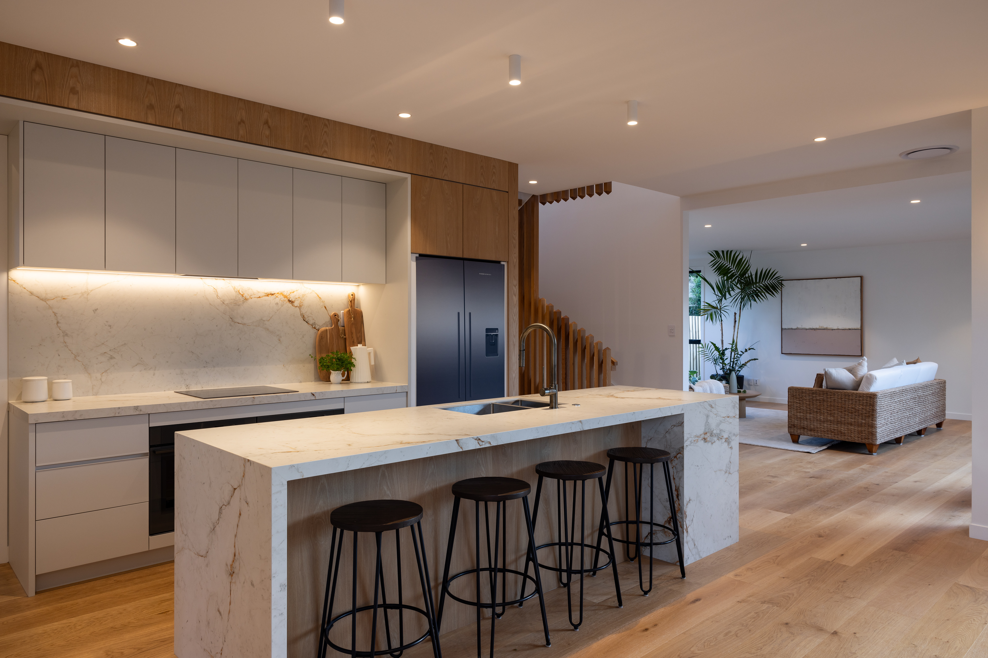 This coastal home is a carefully crafted response to its environment, featuring a refined interplay between horizontal and vertical site planes. Clean lines and dynamic forms create visual interest, while the natural muted tones allow the design to respond to its surroundings. The design creates a sense of discovery, with a journey unfolding as one approaches the entrance. Inside, the design emphases connection and flow, with expansive windows inviting natural light and seamlessly linking indoor and outdoor spaces. The layout creates a clear distinction between private and public. The ground floor functions as an entertainment hub, where the living and kitchen areas are designed for social interaction and gathering. The upper level, in contrast, provides a private retreat, offering spaces for relaxation. This home embodies balance - bold yet sensitive and functional yet serene.
