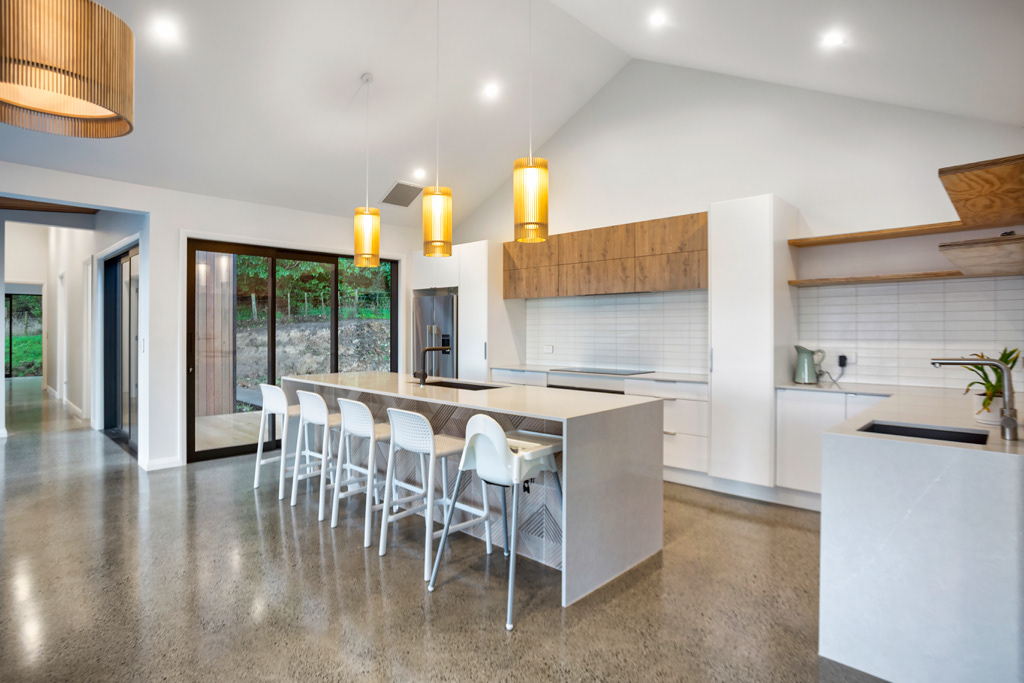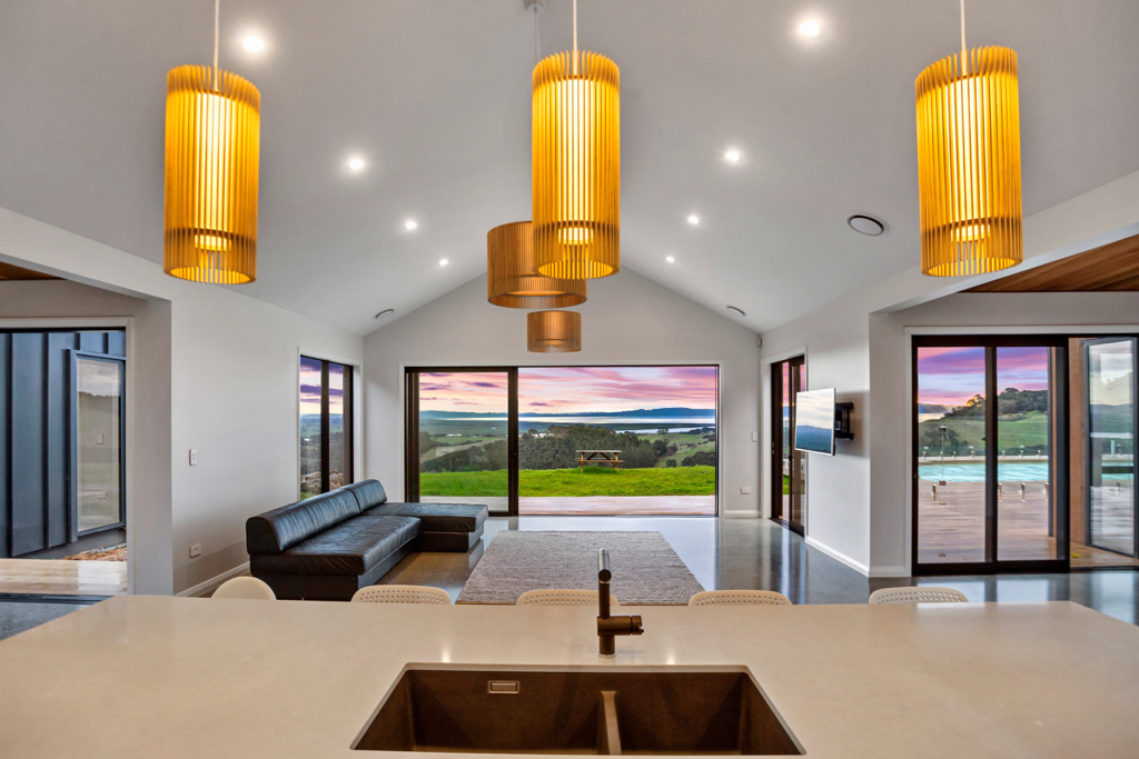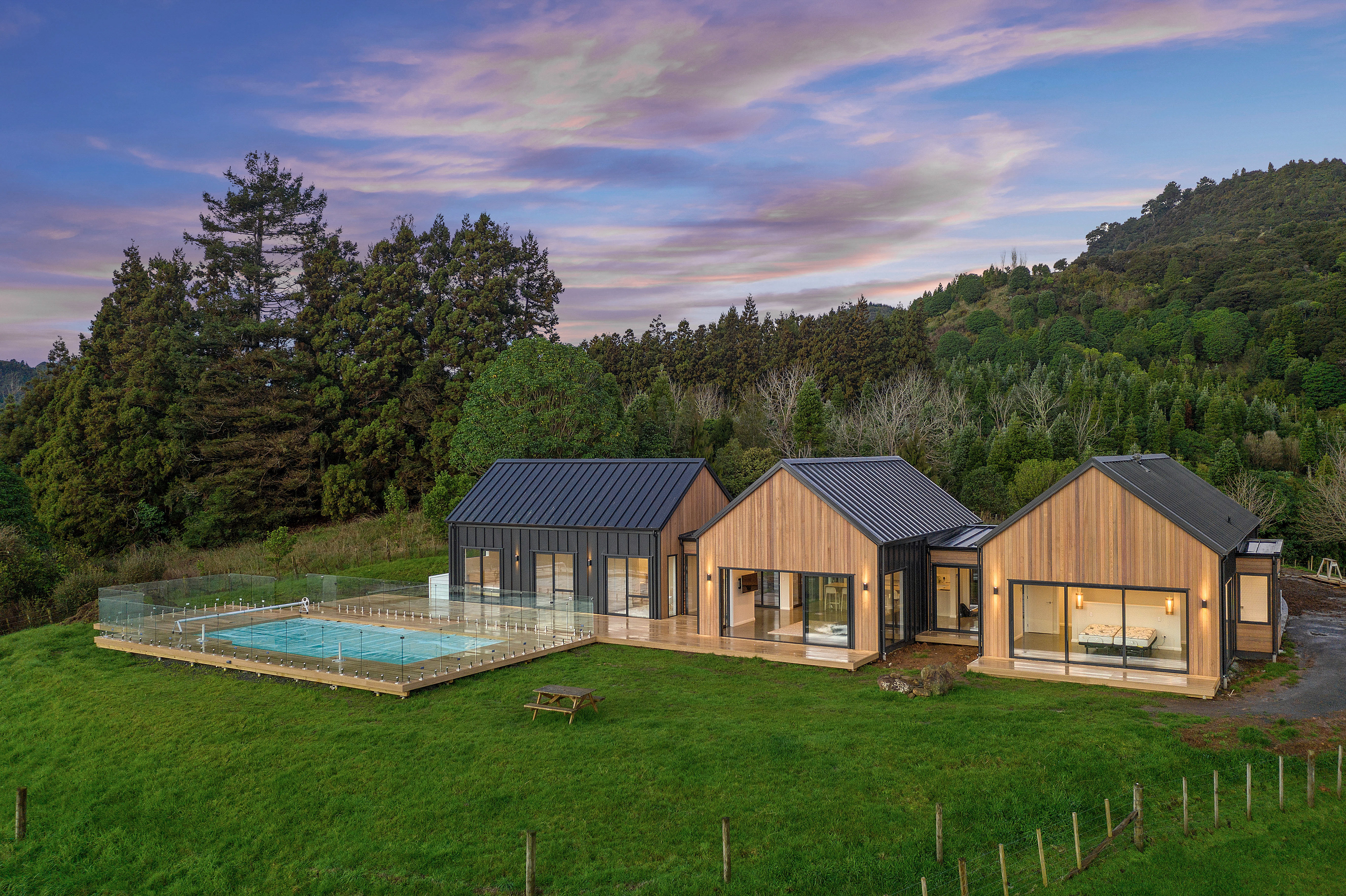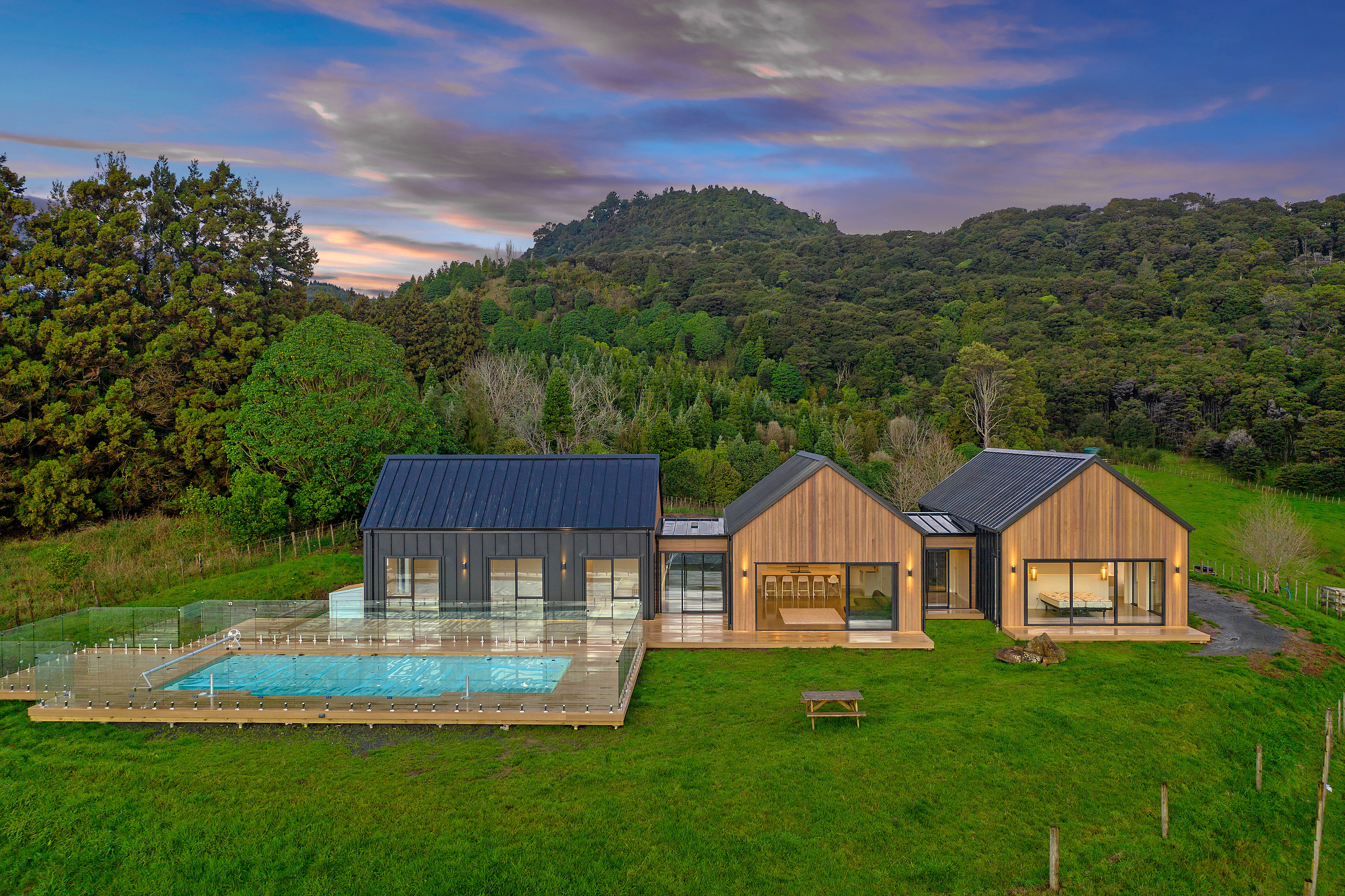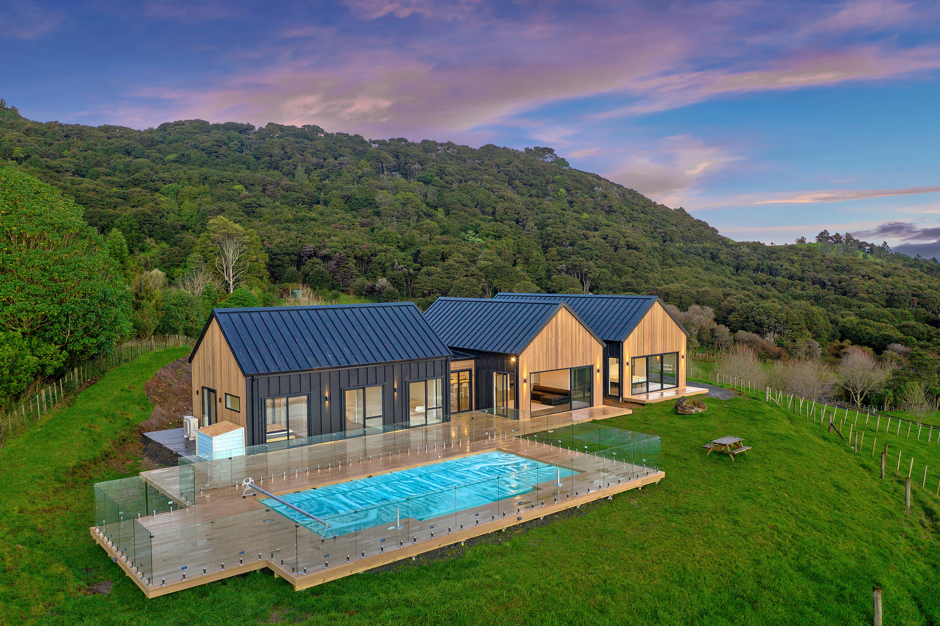 With its striking colour palette of cedar and euro profile metal roofing and cladding, this single level 4 bedroom home is designed to fit into its surroundings, nestled into lush native bush and enjoying dramatic panoramic views over the Thames basin and the Waikato plains.