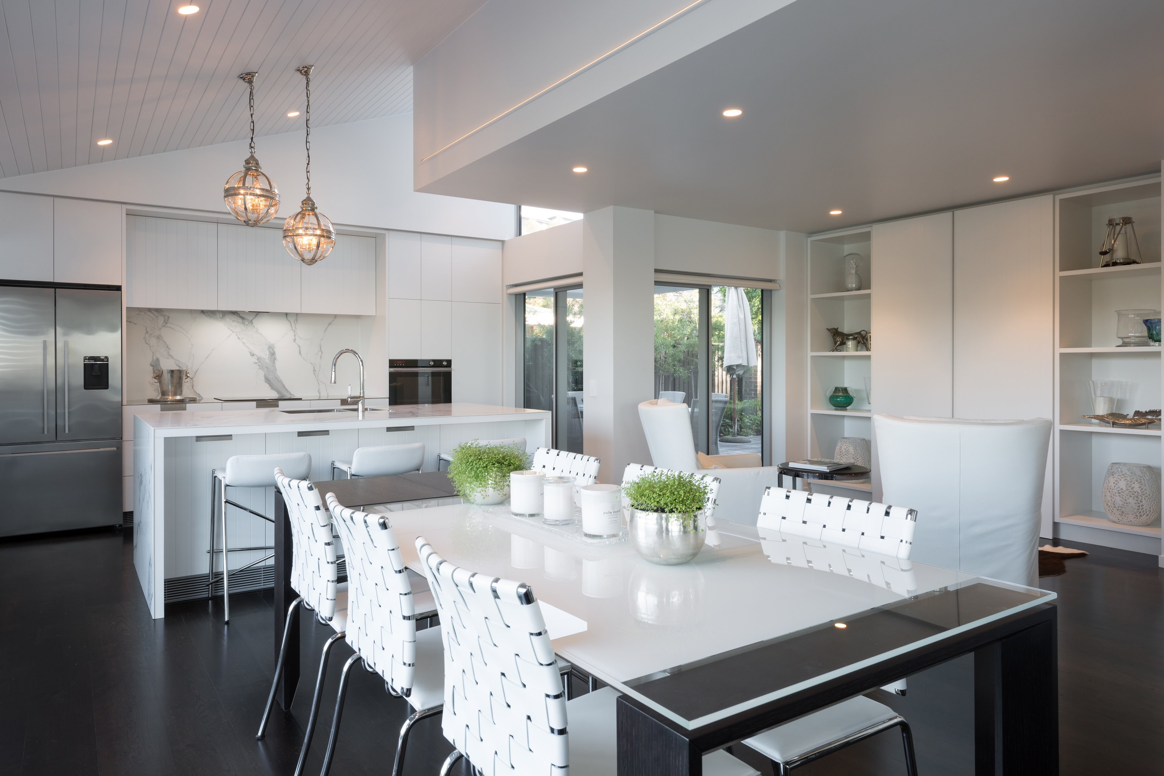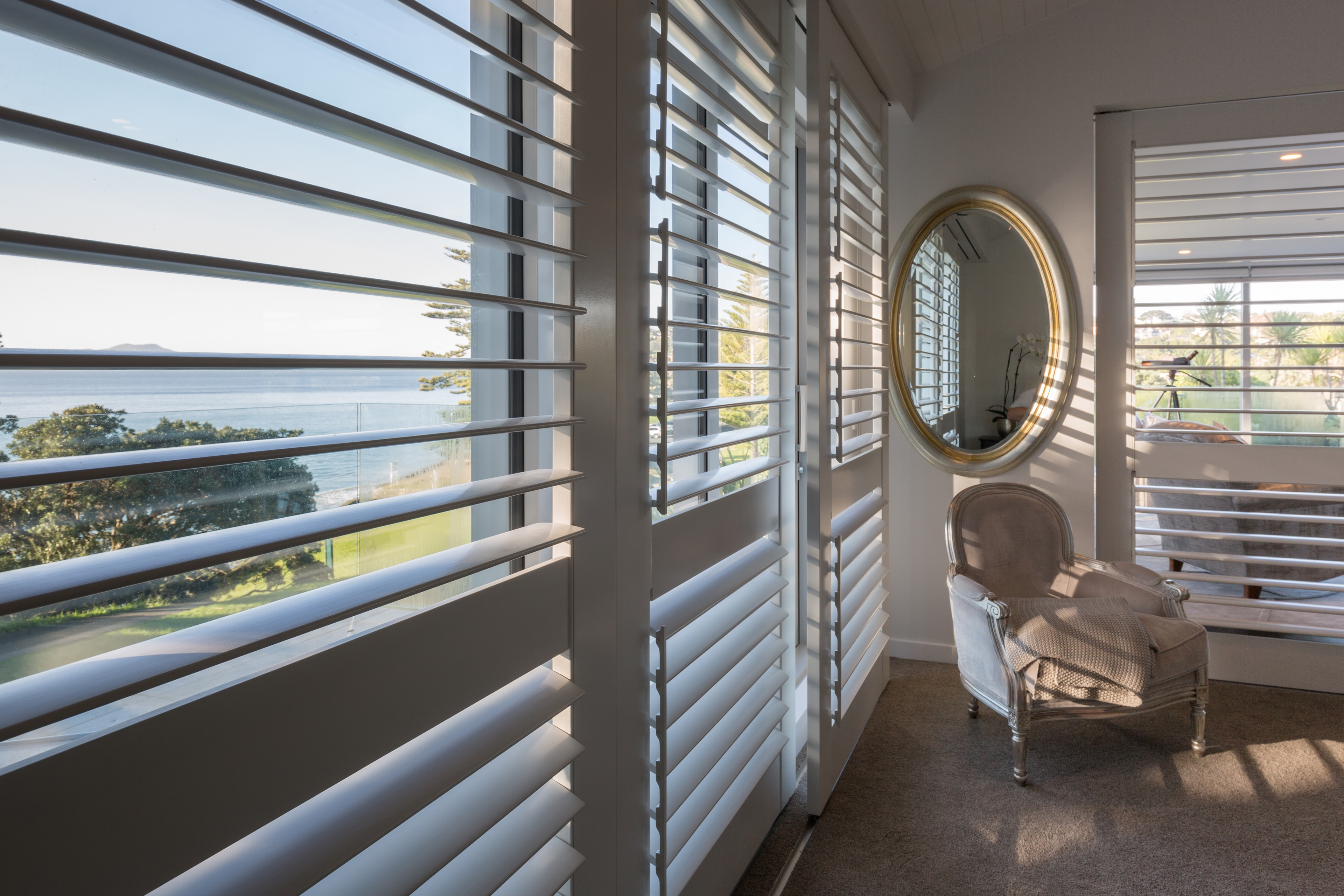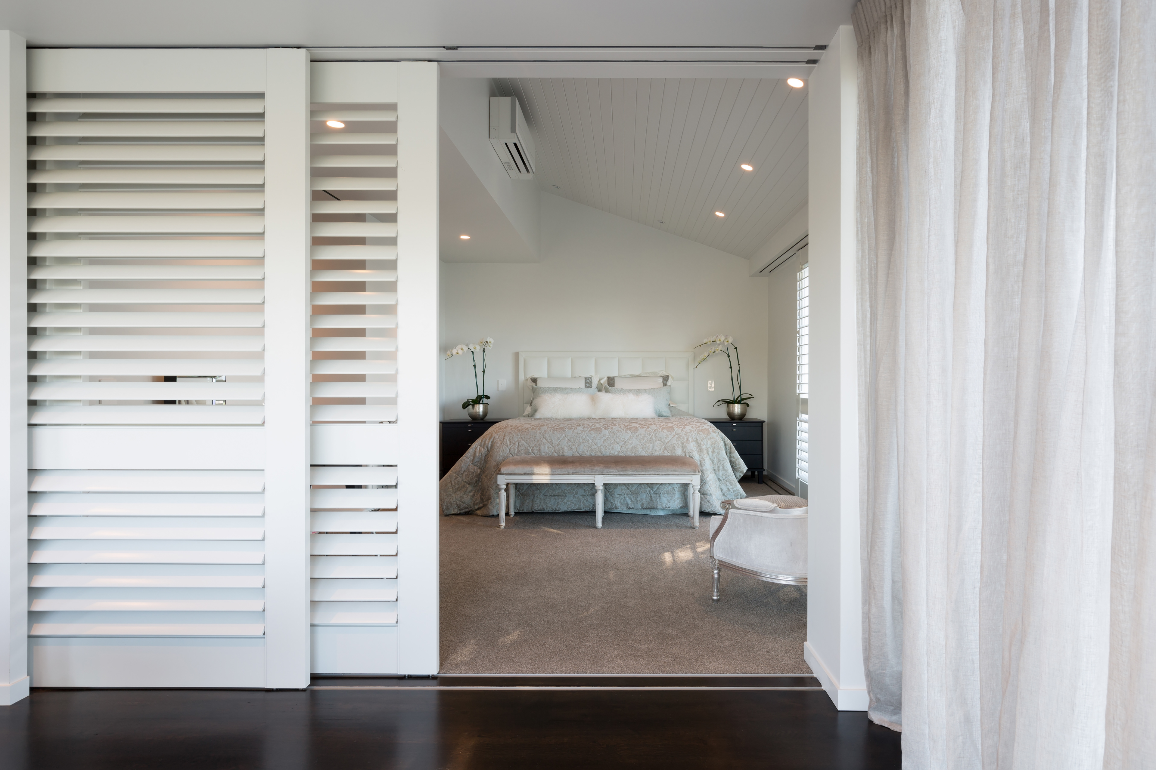 Situated in the coastal suburb of Mairangi Bay, this Auckland beachfront home has coastal views of Rangitoto Island and the Hauraki Gulf. The brief was to renovate the 1970’s home to create easy apartment living for the residing couple without compromising accommodation for guests. Spread over one level, the apartment style renovation incorporates a ‘Hamptons’ feel. The reconfigured layout makes the most of the dramatic coastal views, turning what was considered a winter home into a summer beach apartment. The floor plan consists of an open plan kitchen, dining and living area orientated towards the coastal view and to take advantage of all day sun. The master bedroom with its ensuite and walk in wardrobe divided off from the main living by sliding timber louvre screens carries on the Hamptons apartment theme. Upstairs bedrooms and bathrooms now become a separate guest wing.