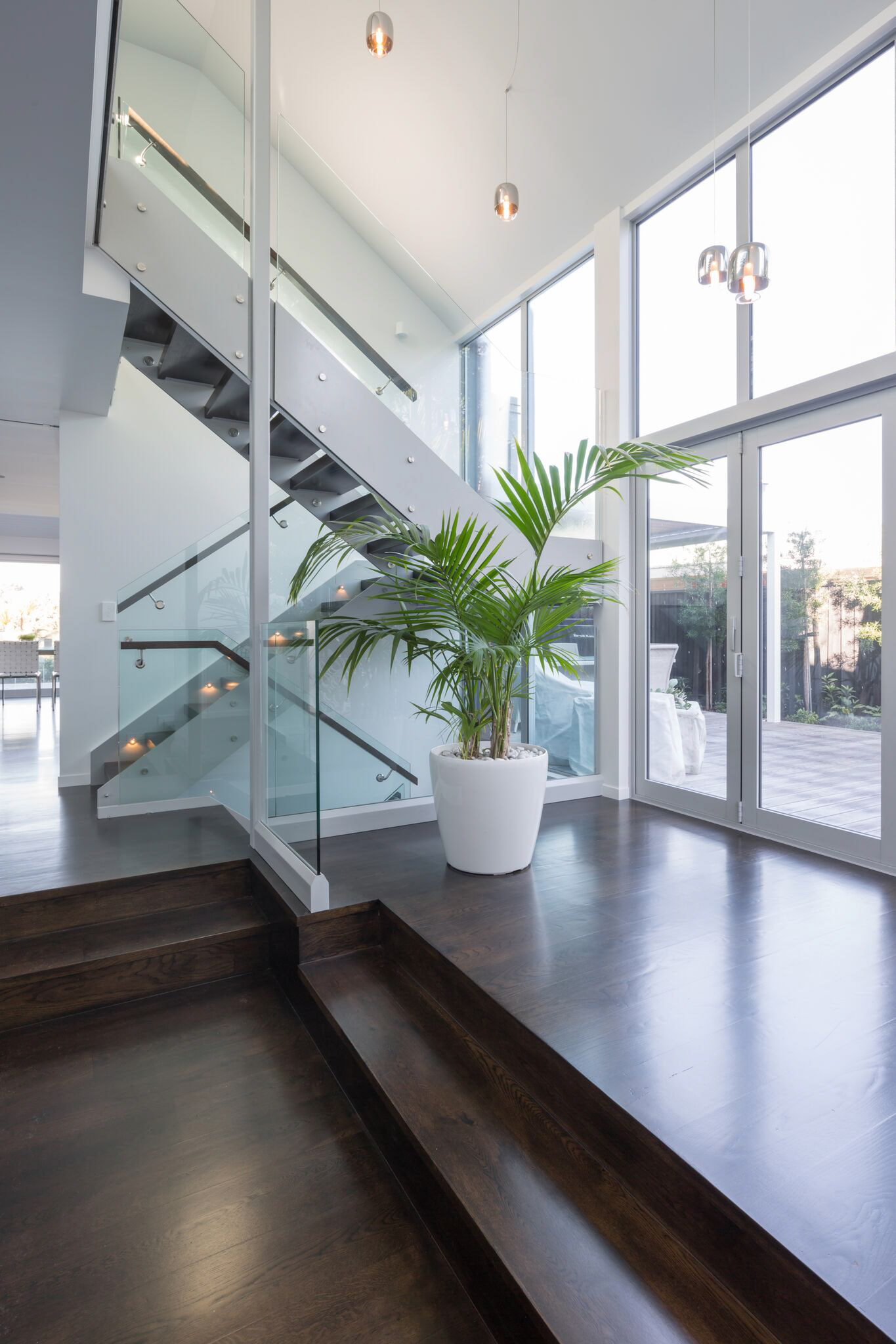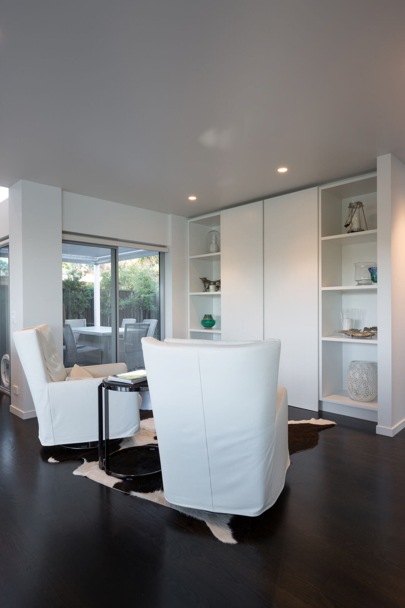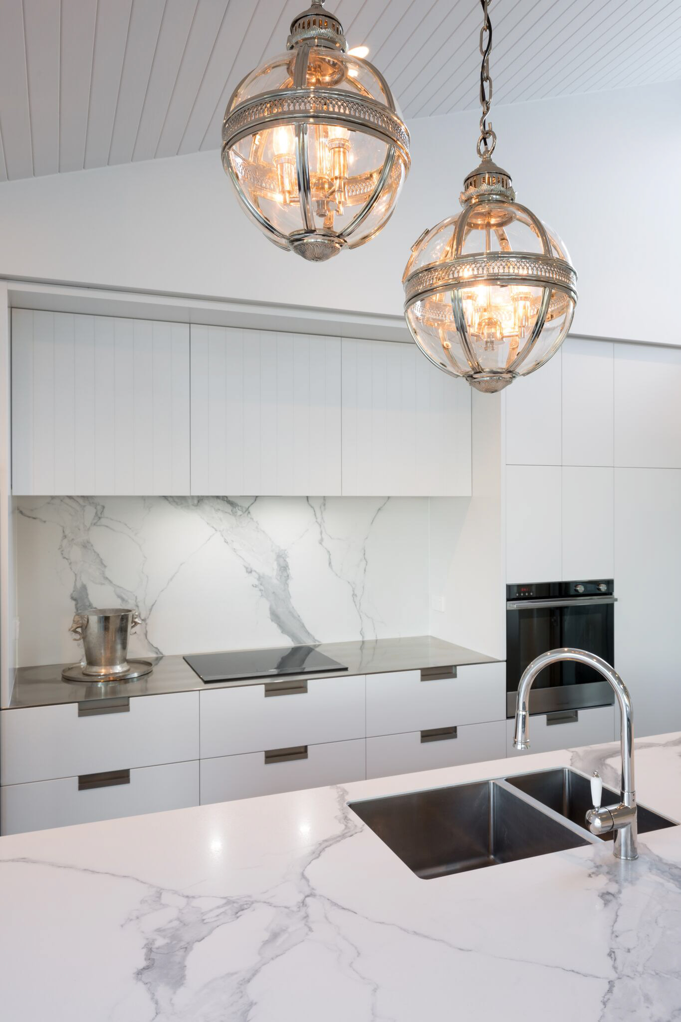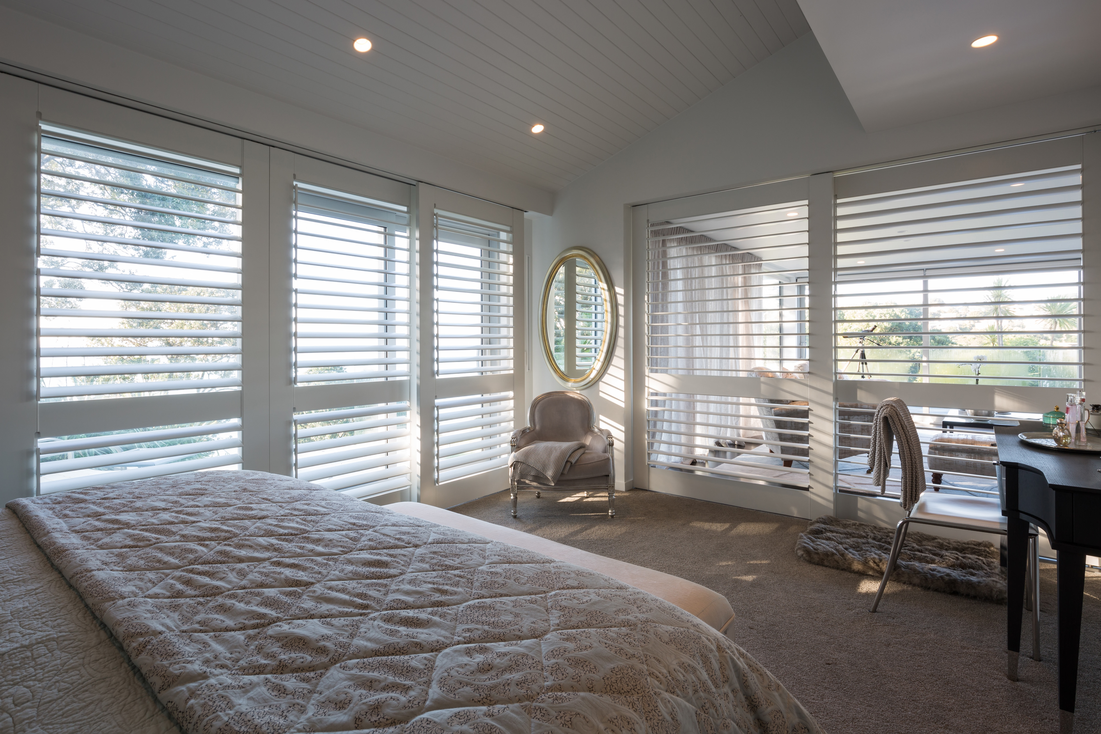 Situated in the coastal suburb of Mairangi Bay, this Auckland beachfront home has coastal views of Rangitoto Island and the Hauraki Gulf. The brief was to renovate the 1970’s home to create easy apartment living for the residing couple without compromising accommodation for guests. Spread over one level, the apartment style renovation incorporates a ‘Hamptons’ feel. The reconfigured layout makes the most of the dramatic coastal views, turning what was considered a winter home into a summer beach apartment. The floor plan consists of an open plan kitchen, dining and living area orientated towards the coastal view and to take advantage of all day sun. The master bedroom with its ensuite and walk in wardrobe divided off from the main living by sliding timber louvre screens carries on the Hamptons apartment theme. Upstairs bedrooms and bathrooms now become a separate guest wing.