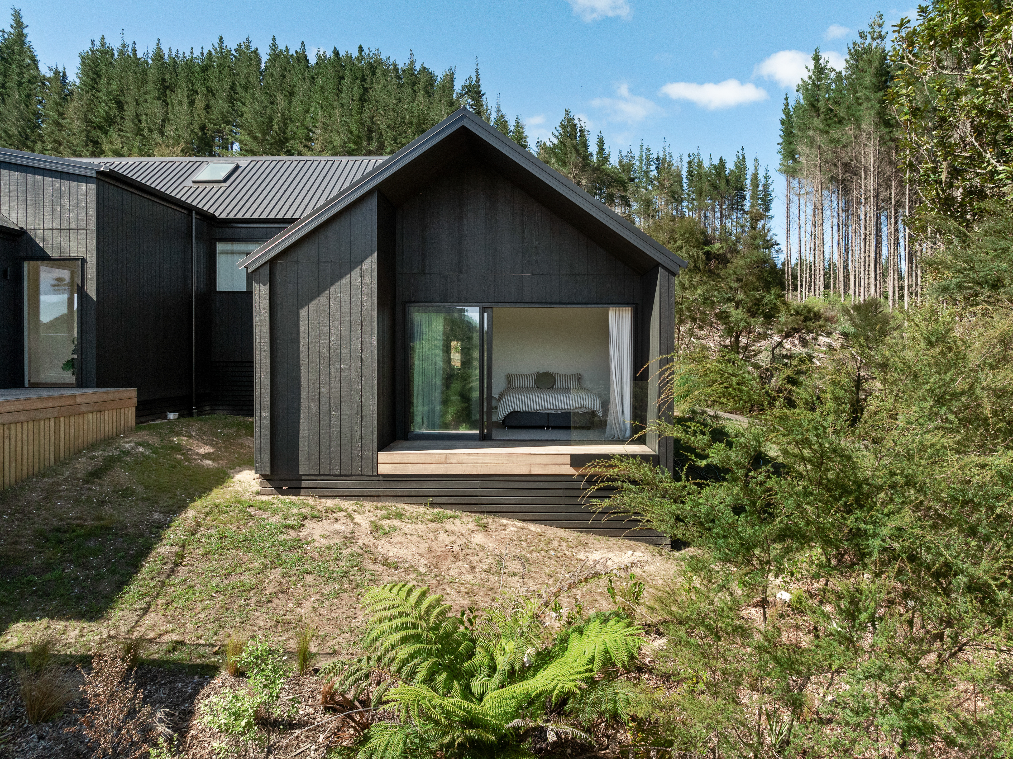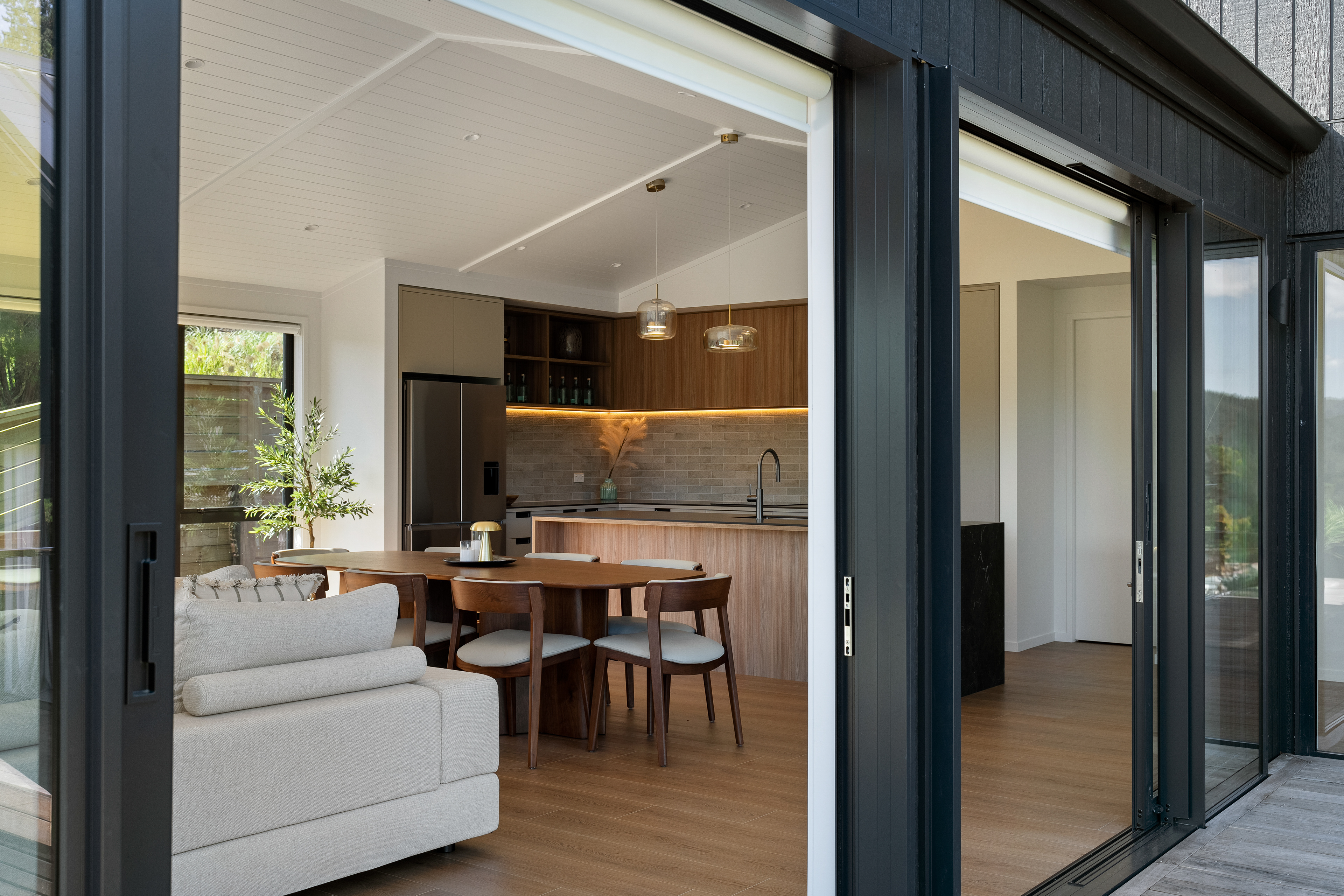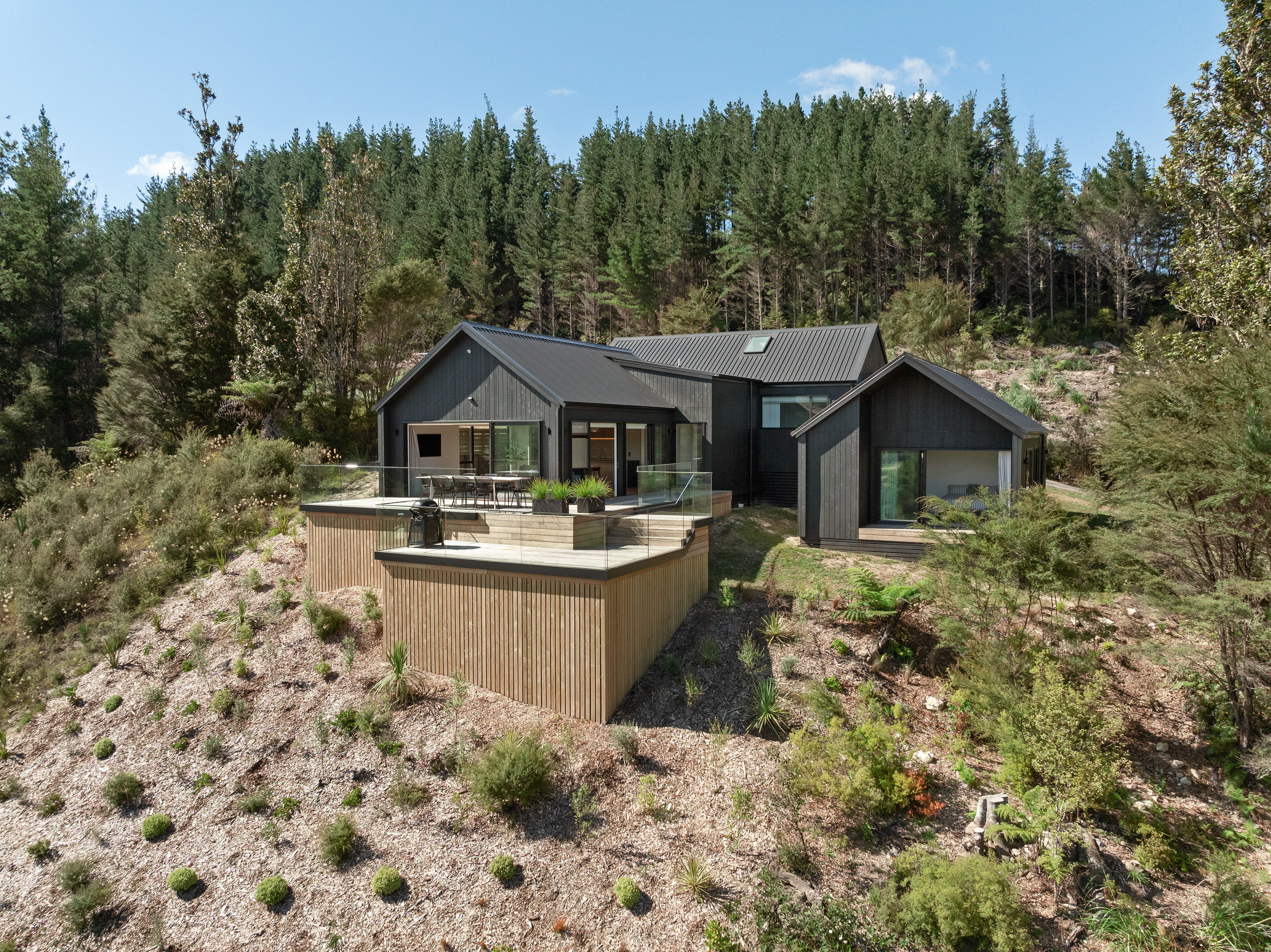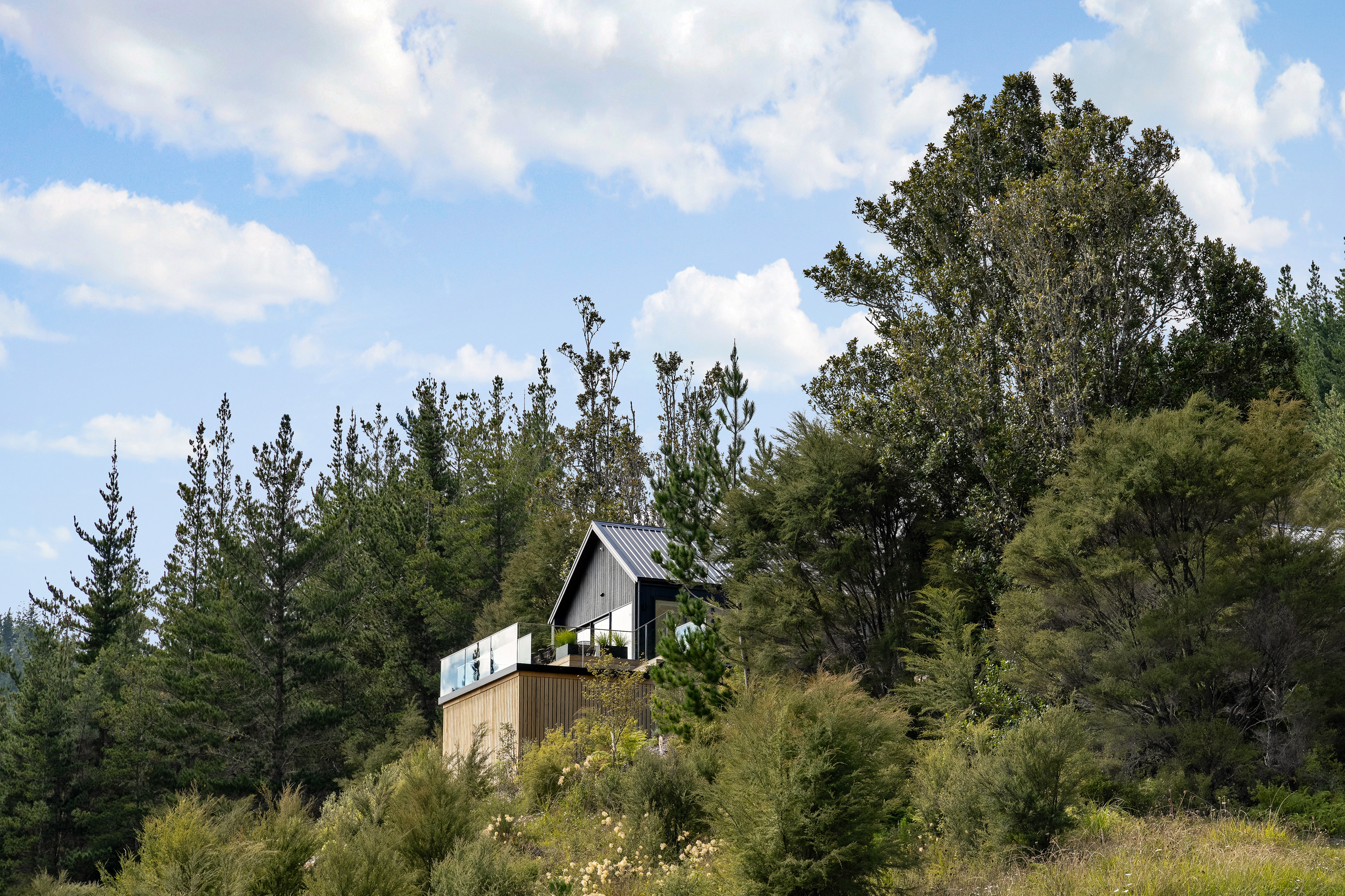 Set within a hillside in Pauanui, this project is carefully positioned to engage with its elevated site. Living and sleeping areas are clearly defined, while maintaining visual connections between them. An outdoor deck extends from the main living space, providing a direct connection to the surrounding landscape. A palette of dark cladding and timber allows the building to sit comfortably within its bush setting, while light-filled interiors support a practical and considered living environment.