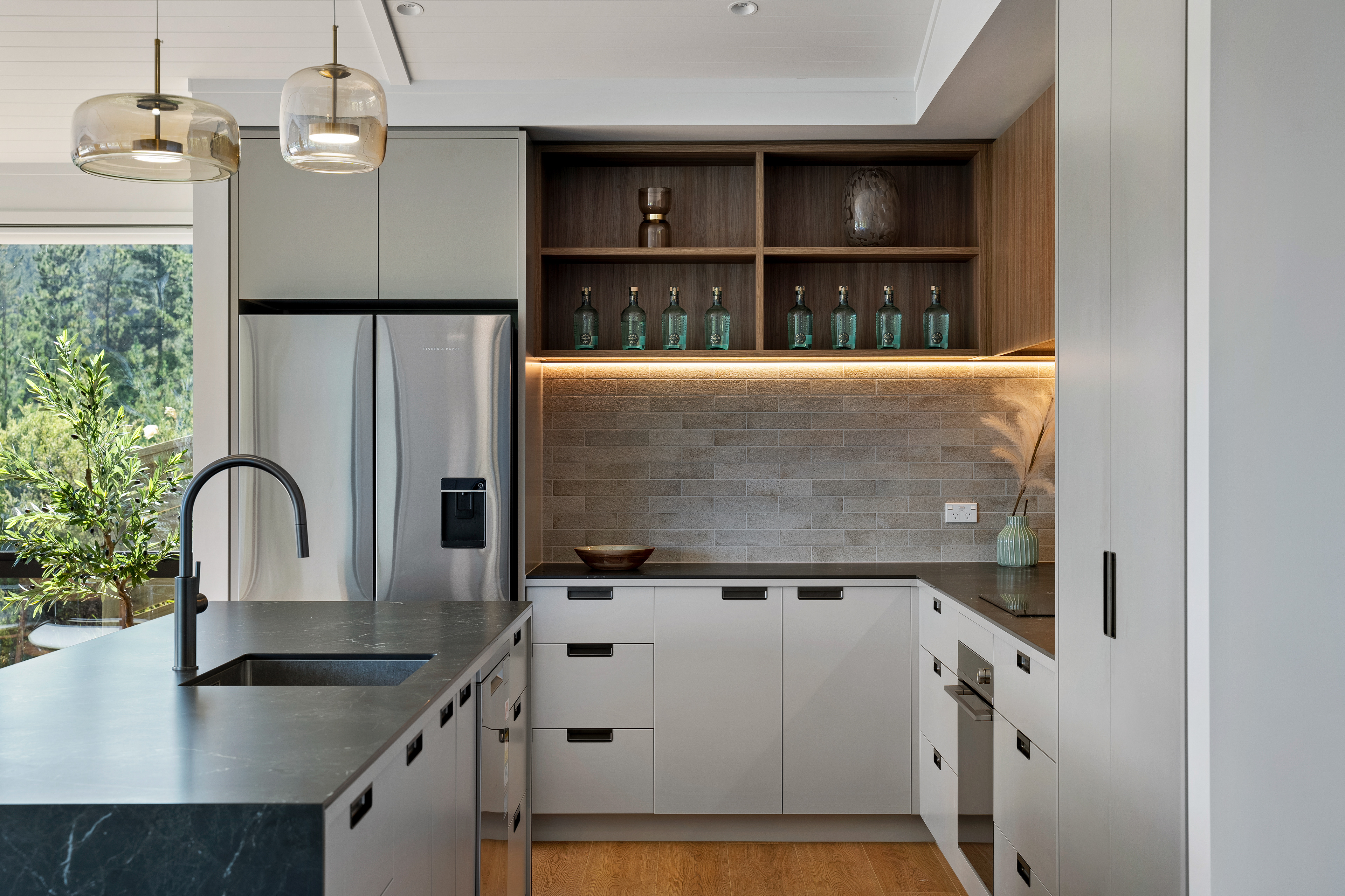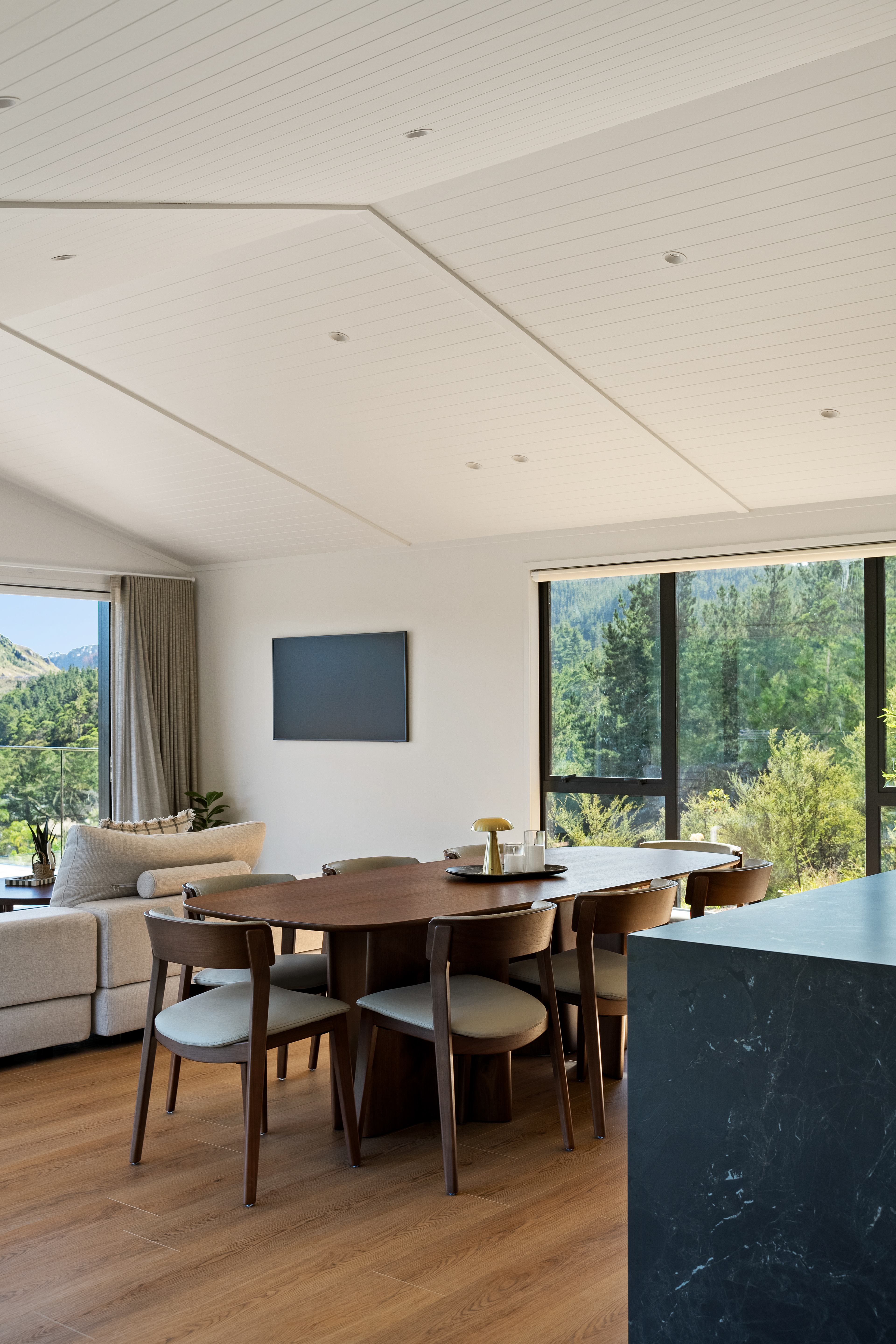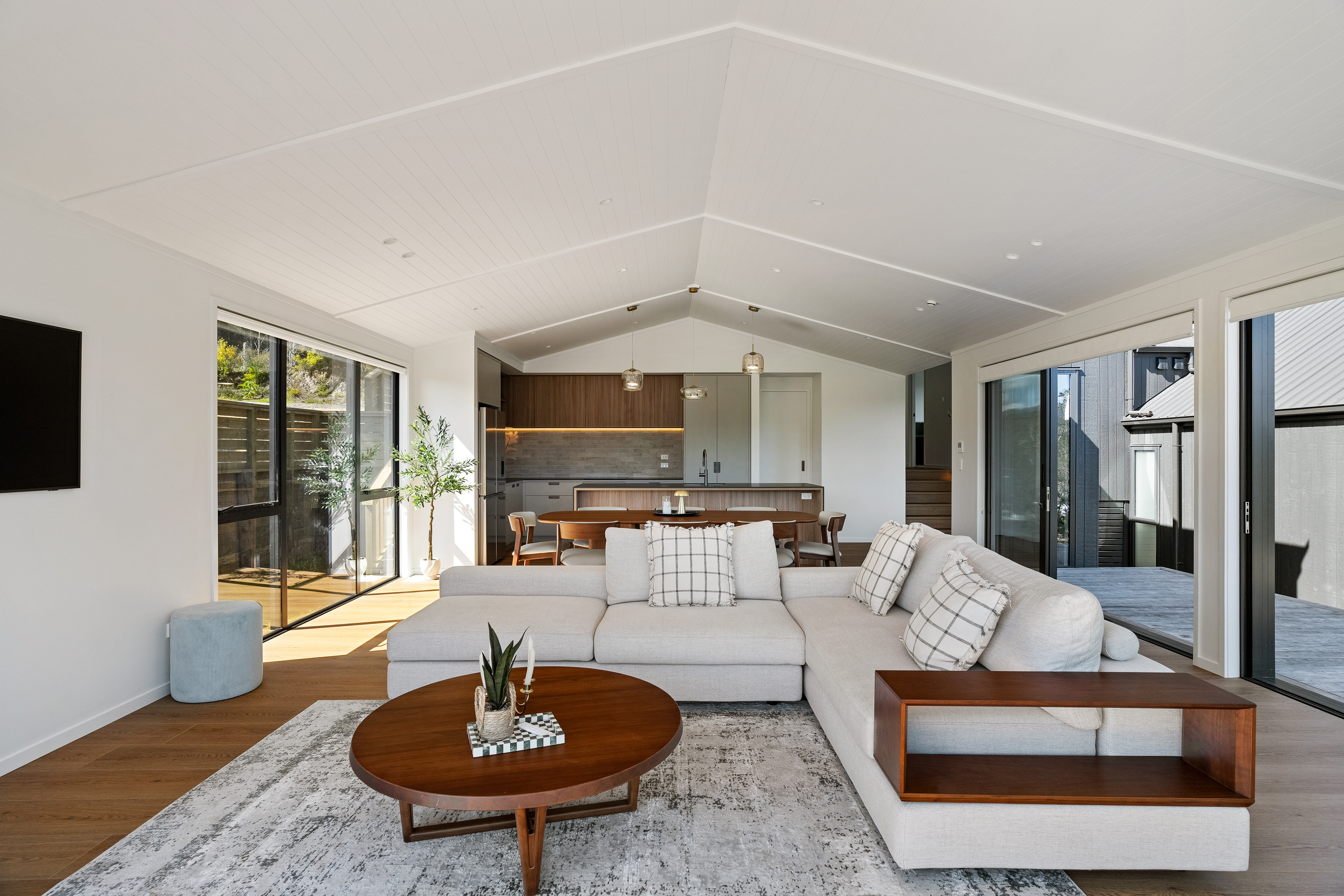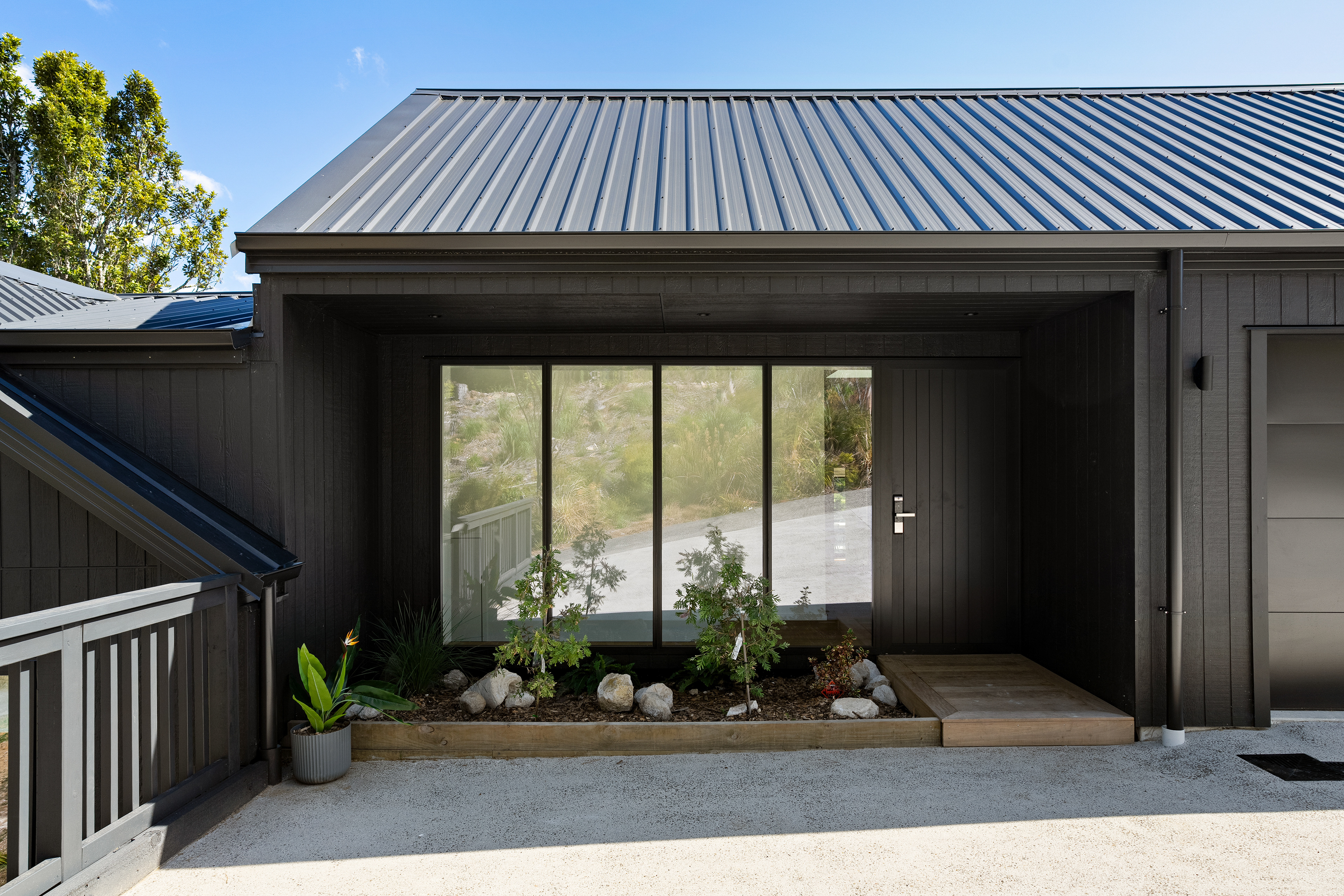 Set within a hillside in Pauanui, this project is carefully positioned to engage with its elevated site. Living and sleeping areas are clearly defined, while maintaining visual connections between them. An outdoor deck extends from the main living space, providing a direct connection to the surrounding landscape. A palette of dark cladding and timber allows the building to sit comfortably within its bush setting, while light-filled interiors support a practical and considered living environment.