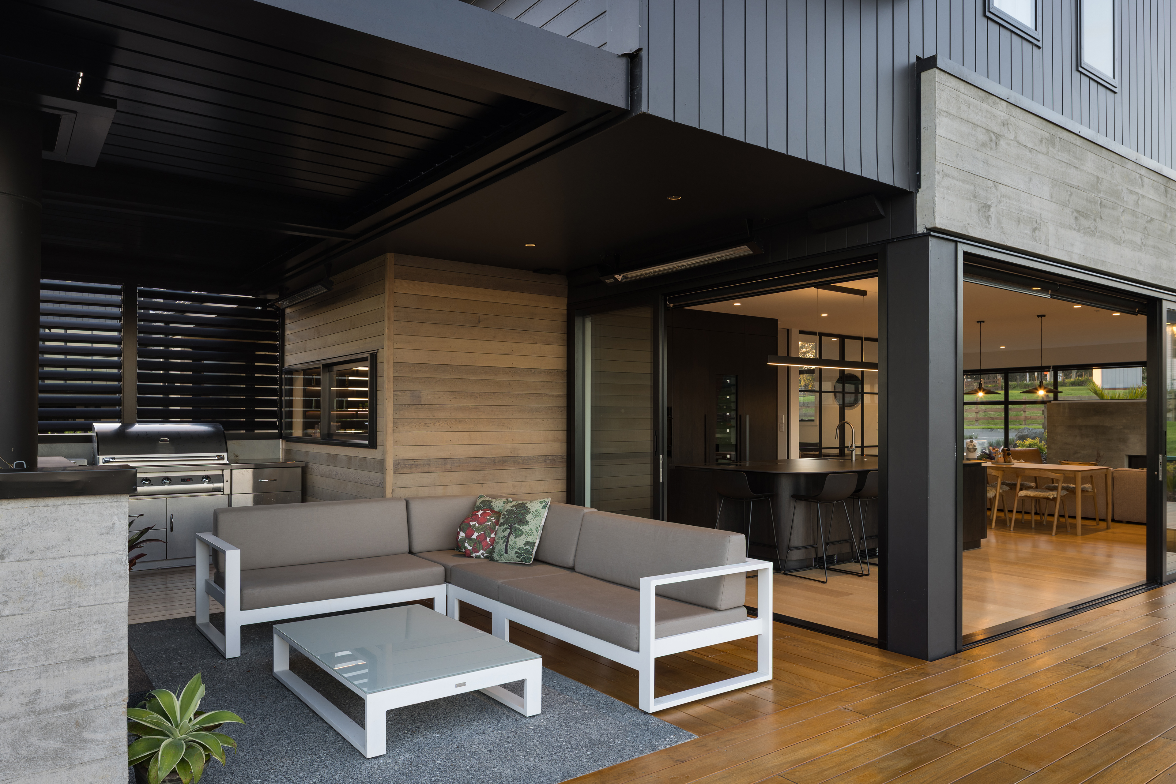 Located in Long Bay, this family home is designed to create a clear balance between shared living and private retreat. At its heart is a generous open-plan living area, where raking ceilings and large openings draw in natural light and blur the line between indoors and out. The kitchen, dining, and main lounge flow seamlessly onto an outdoor living space, creating a unified zone for connection and entertaining. A natural, earthy palette grounds the home in its setting — chosen to sit quietly within the landscape and complement the tones of the surrounding environment. This calm materiality is expressed through warm cedar cladding contrasted with sharp black detailing, giving the home a confident yet welcoming street presence.