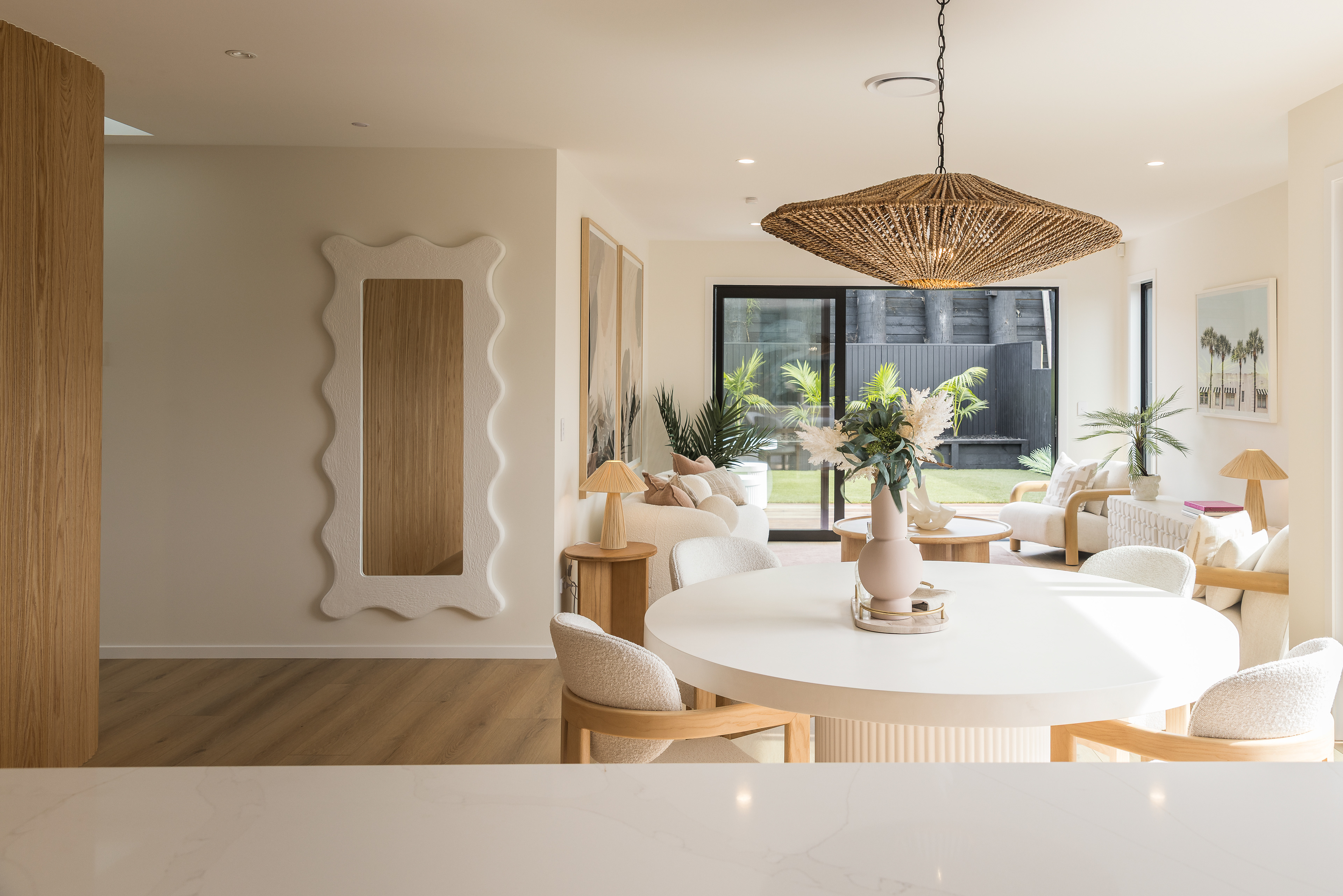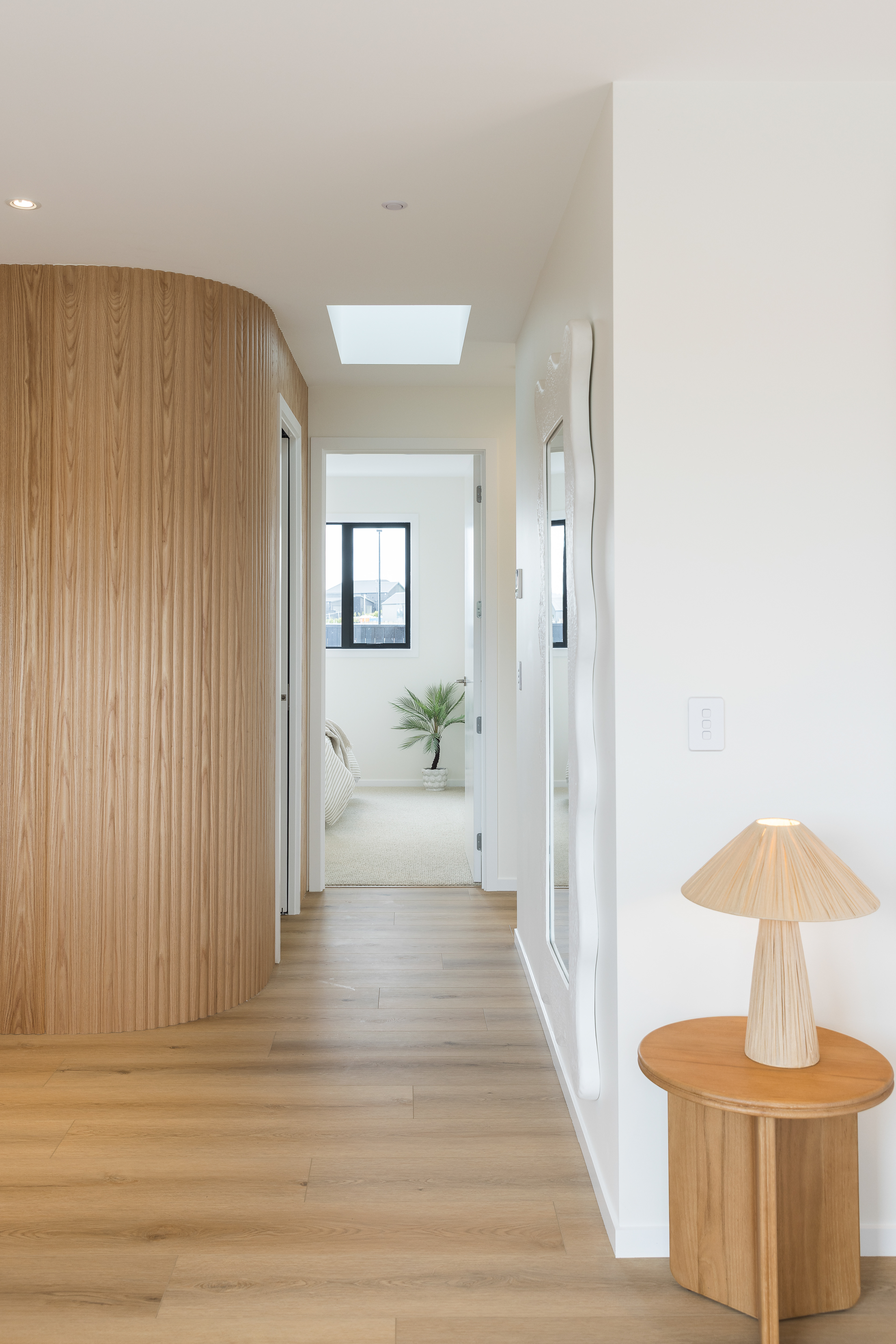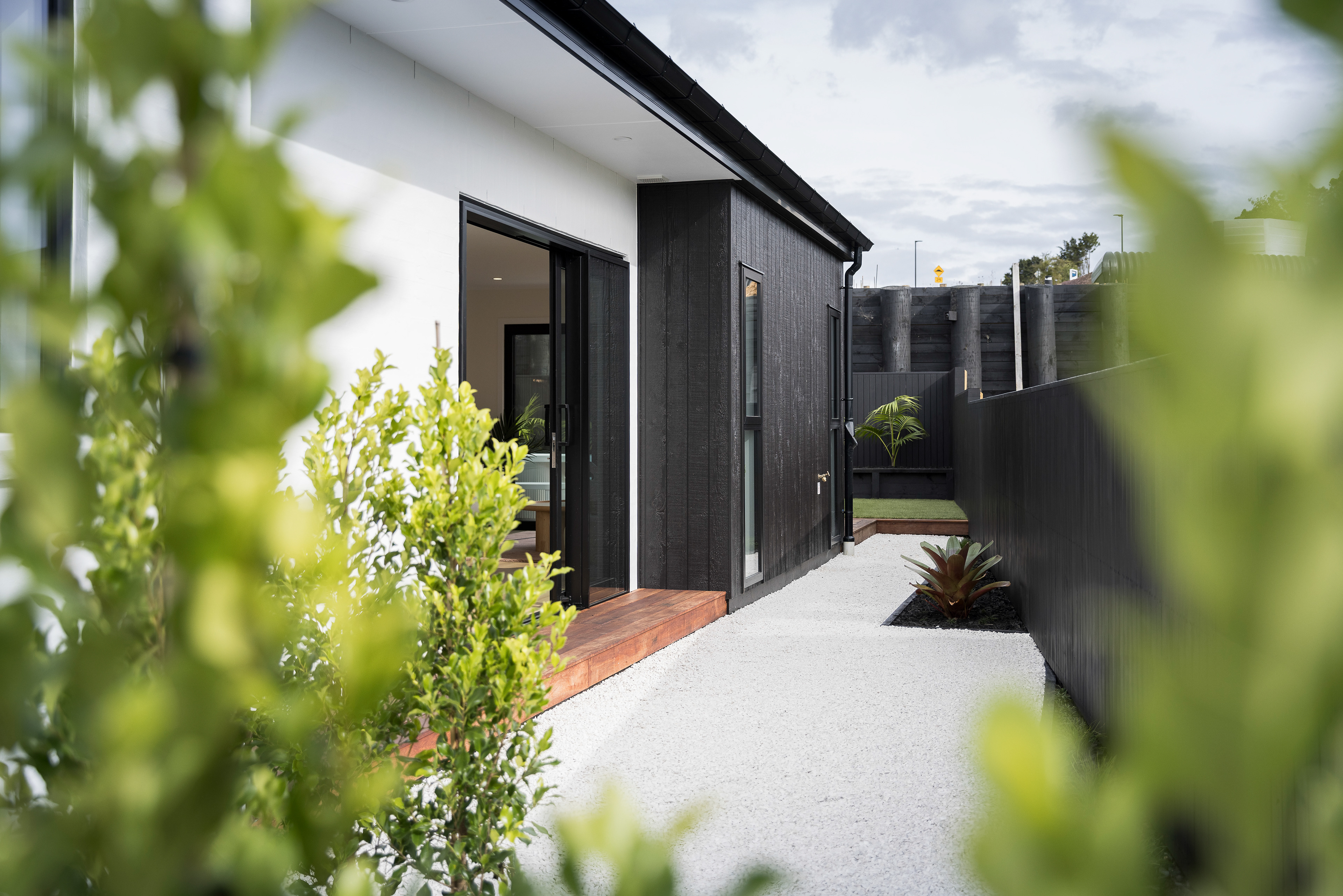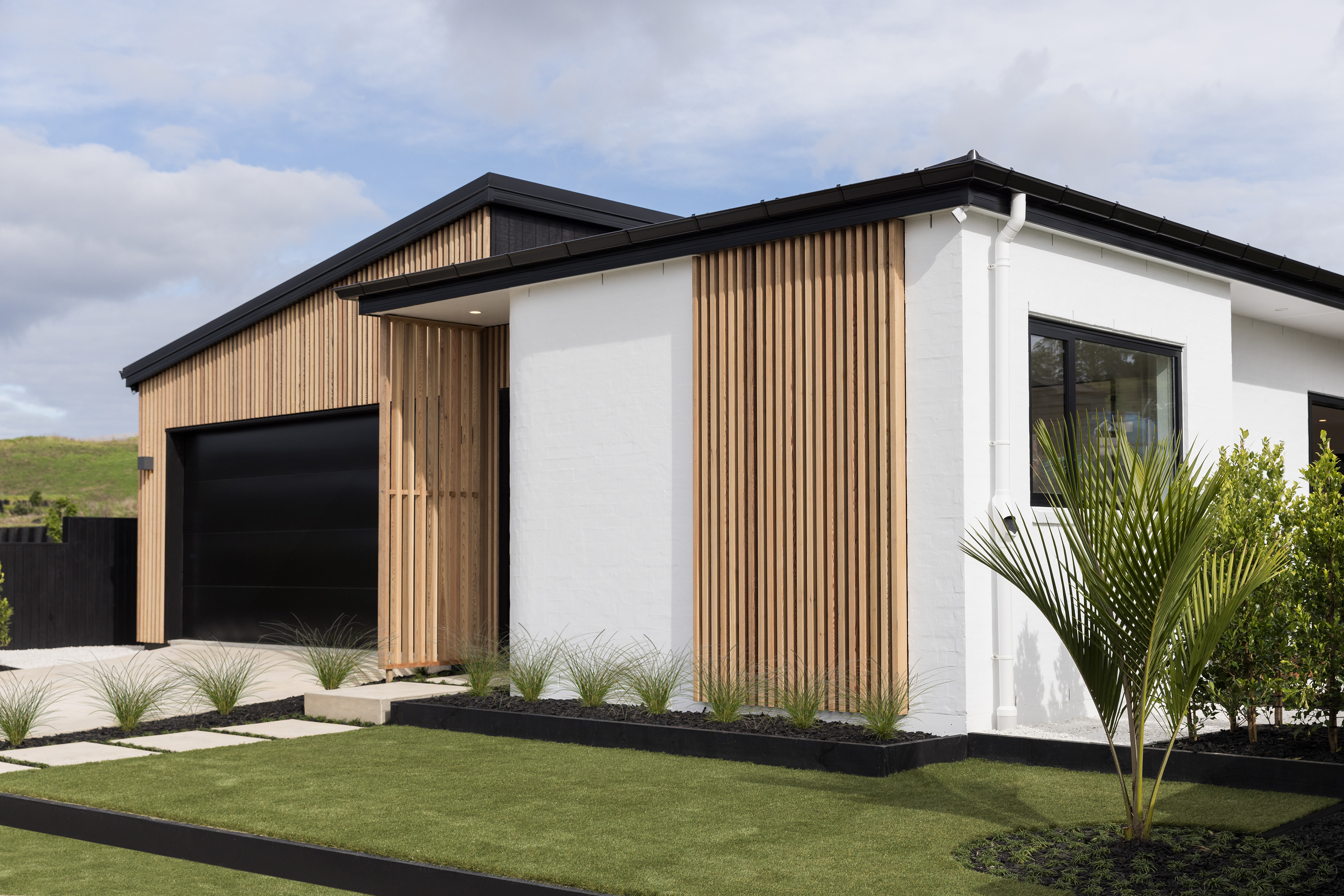 This home, located in Warkworth, blends modern design with thoughtful use of texture and shadows. The exterior pairs sleek, black cladding with warm vertical timber, playing with texture and shadows to engage in visual interest. Clean, angular lines meet soft, rounded corners, adding both structure and warmth. The entrance features a gentle curve, creating a welcoming transition from the outside in. This subtle detail sets the tone for the rest of the space, balancing clean, modern design with a softer, more organic touch. Timber feature walls inside the home bring the outdoors in, creating a flow between the inside and out. Multiple openings and spaces are designed to emphasise indoor-outdoor living, offering easy access to the surrounding nature.