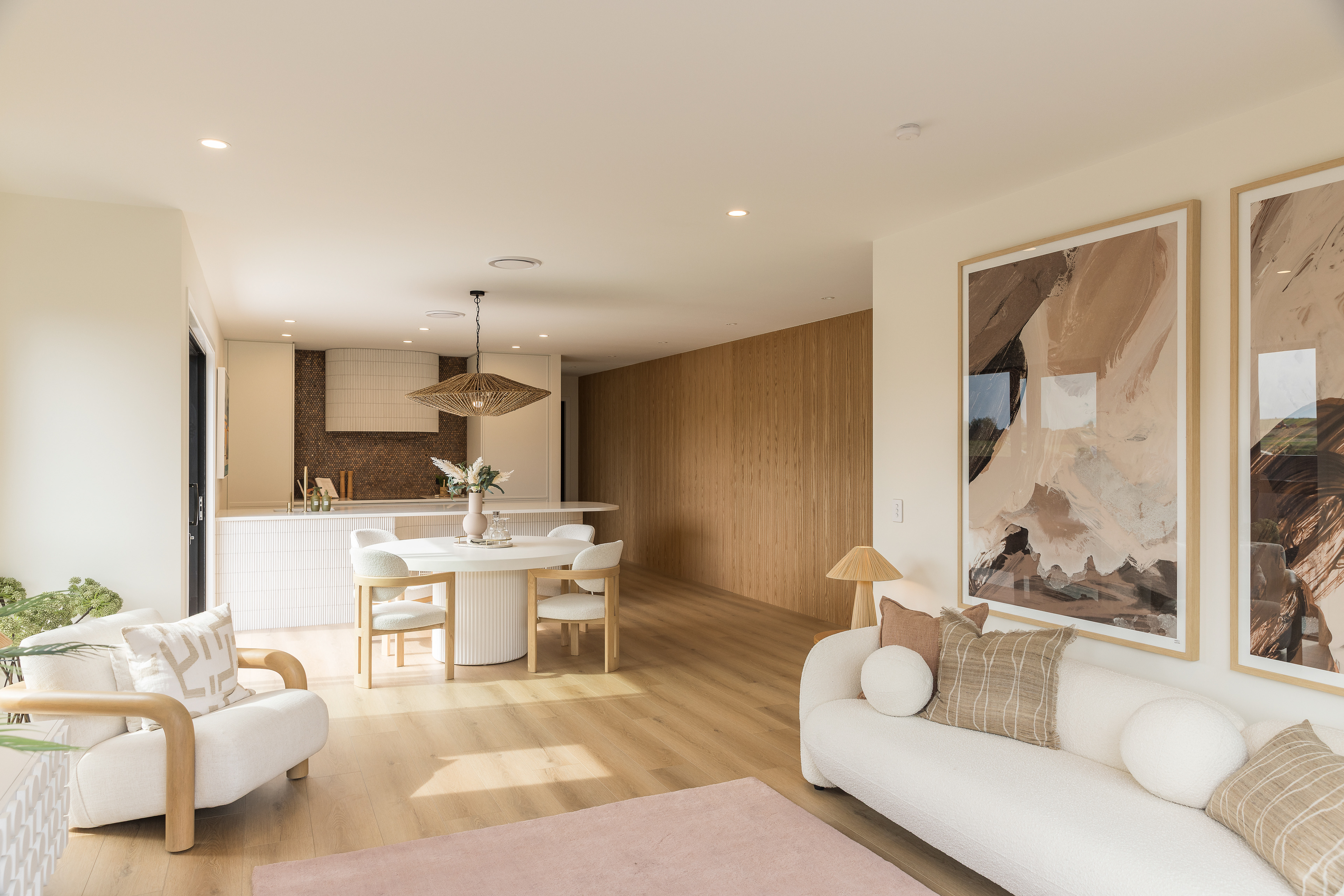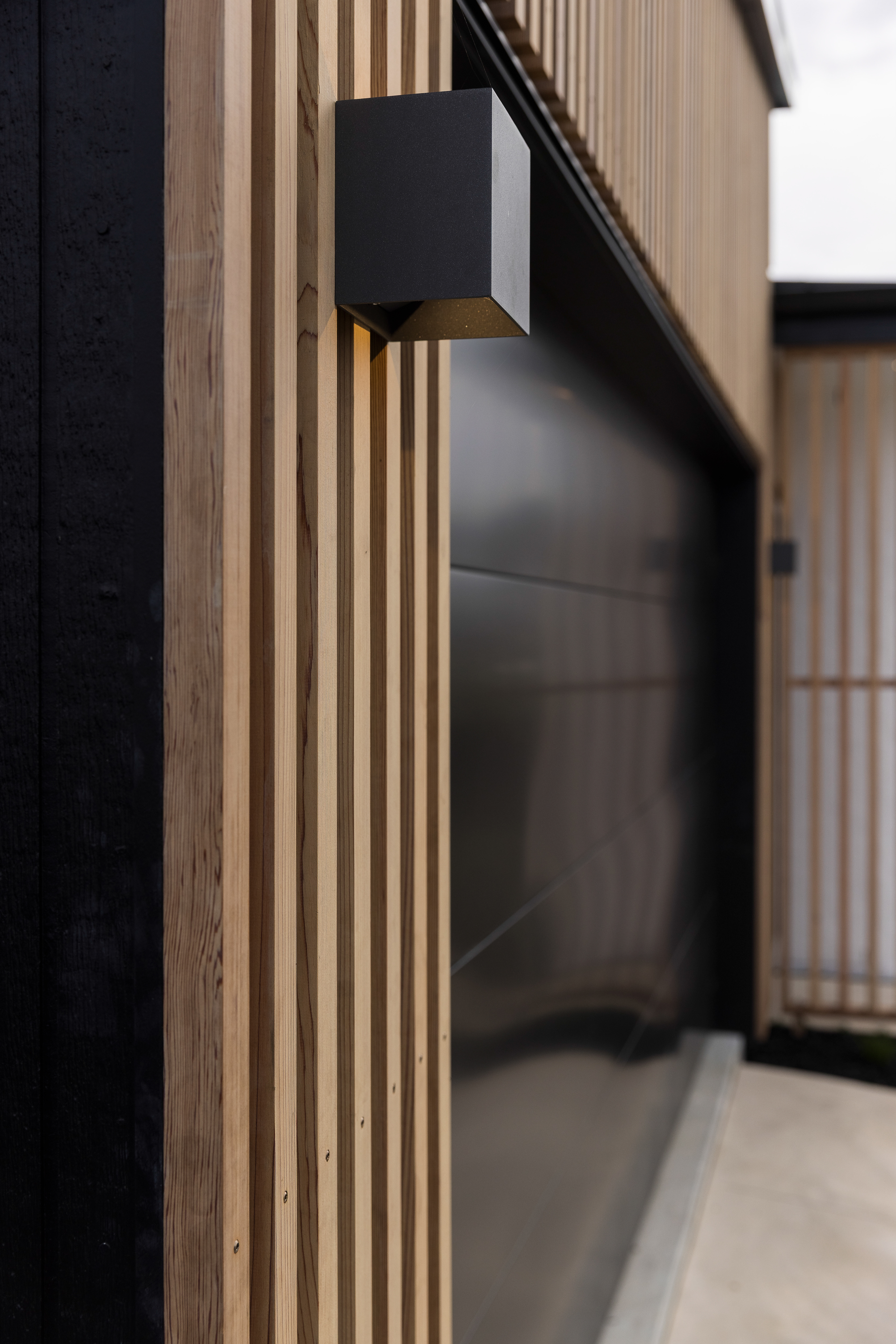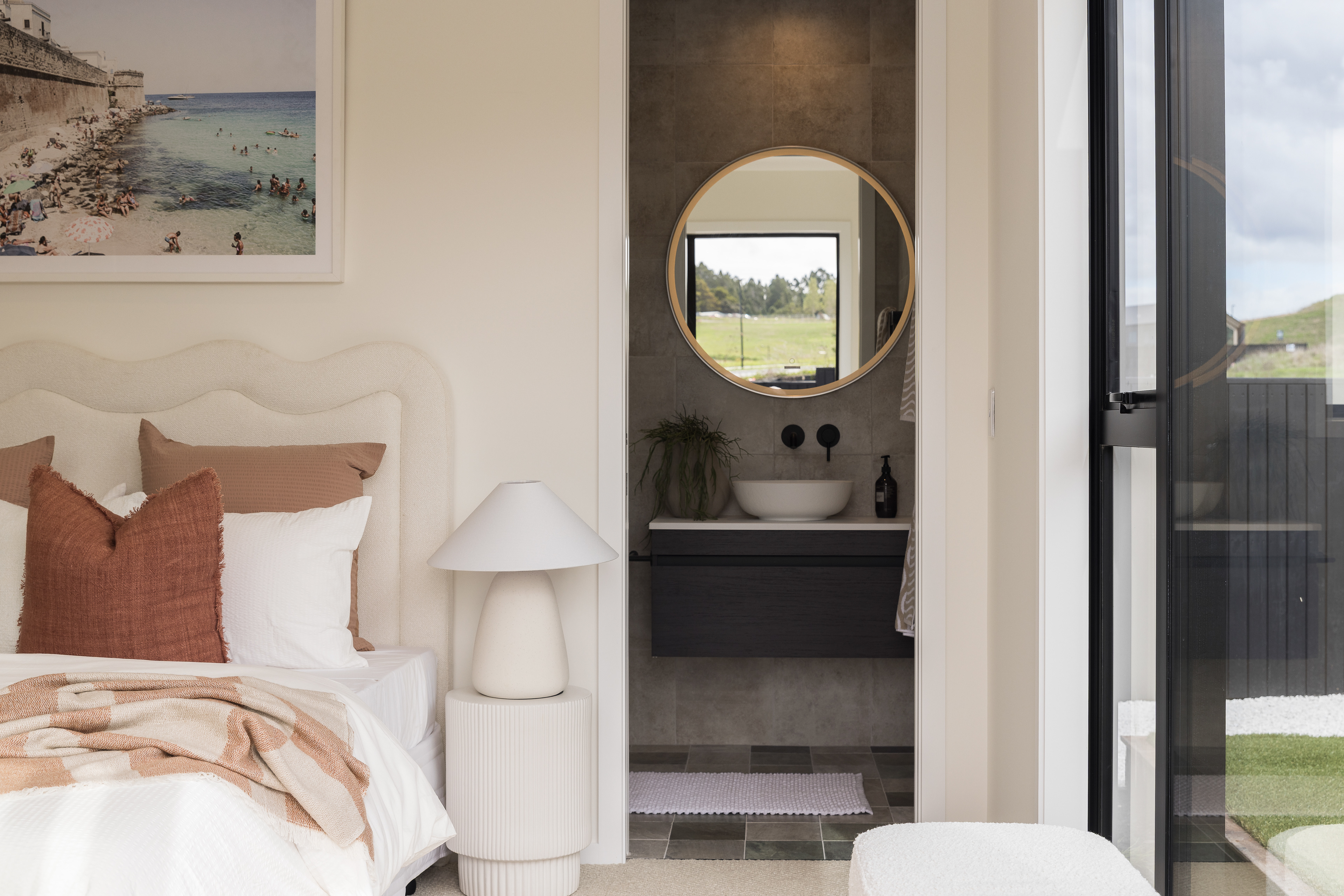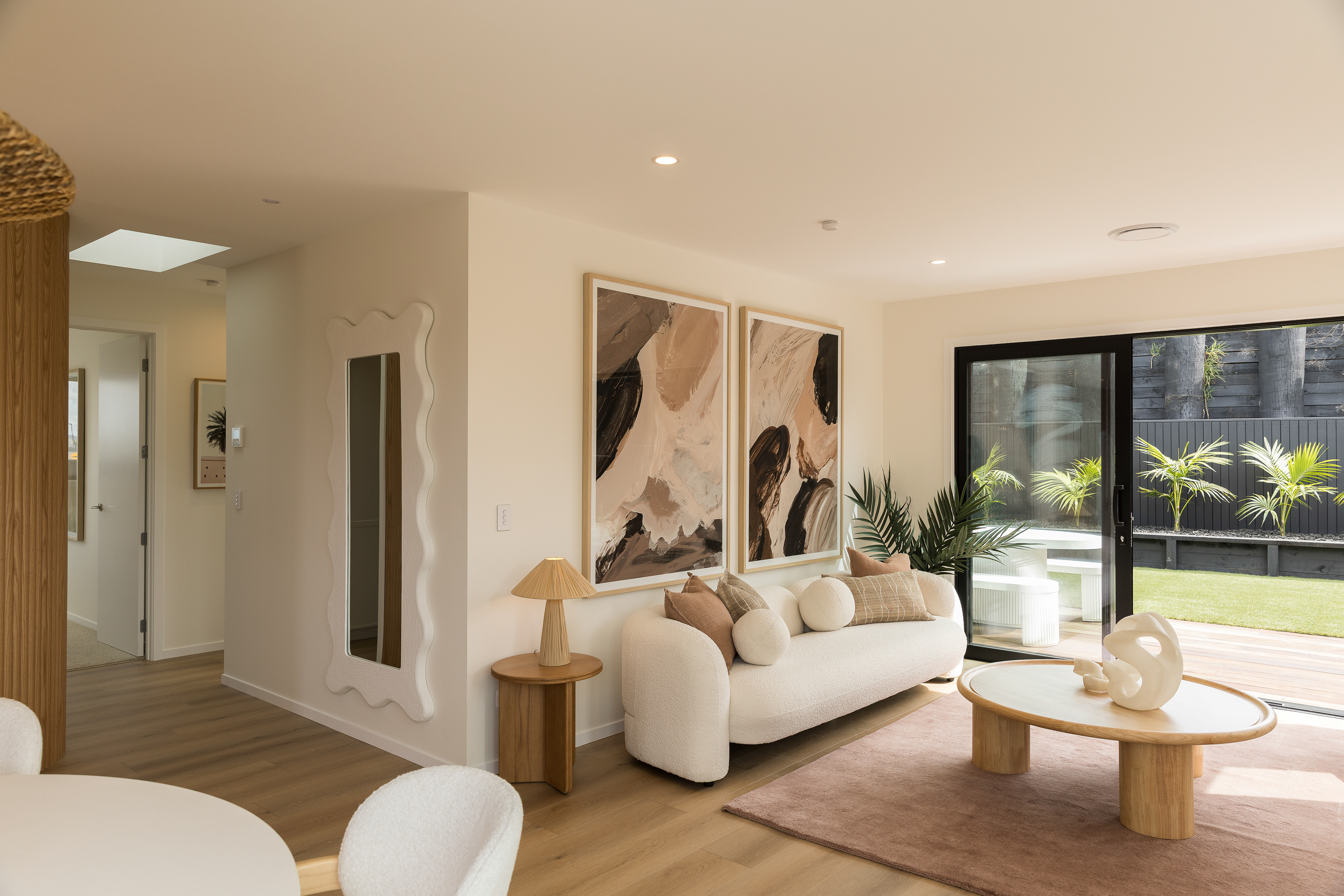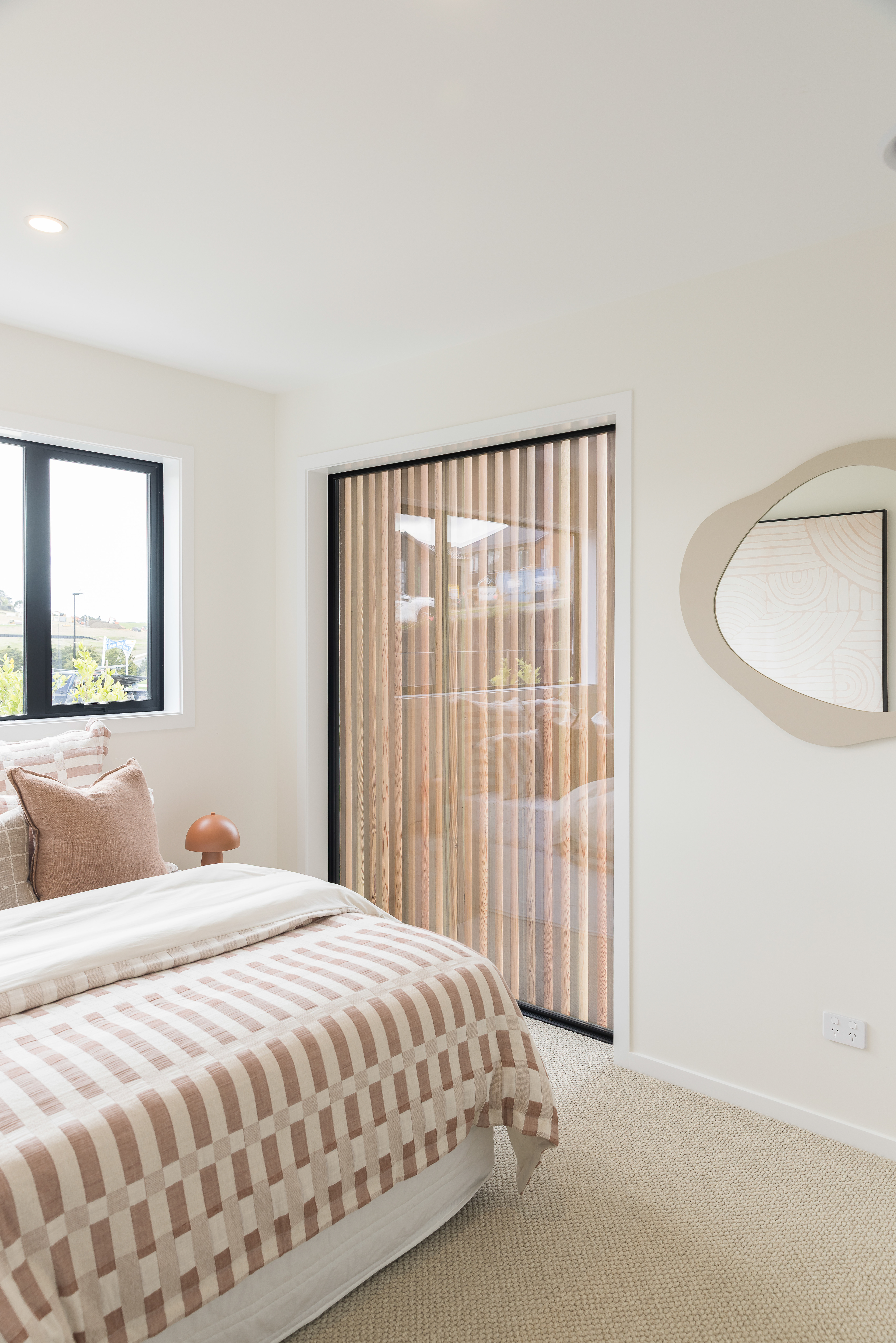 This home, located in Warkworth, blends modern design with thoughtful use of texture and shadows. The exterior pairs sleek, black cladding with warm vertical timber, playing with texture and shadows to engage in visual interest. Clean, angular lines meet soft, rounded corners, adding both structure and warmth. The entrance features a gentle curve, creating a welcoming transition from the outside in. This subtle detail sets the tone for the rest of the space, balancing clean, modern design with a softer, more organic touch. Timber feature walls inside the home bring the outdoors in, creating a flow between the inside and out. Multiple openings and spaces are designed to emphasise indoor-outdoor living, offering easy access to the surrounding nature.