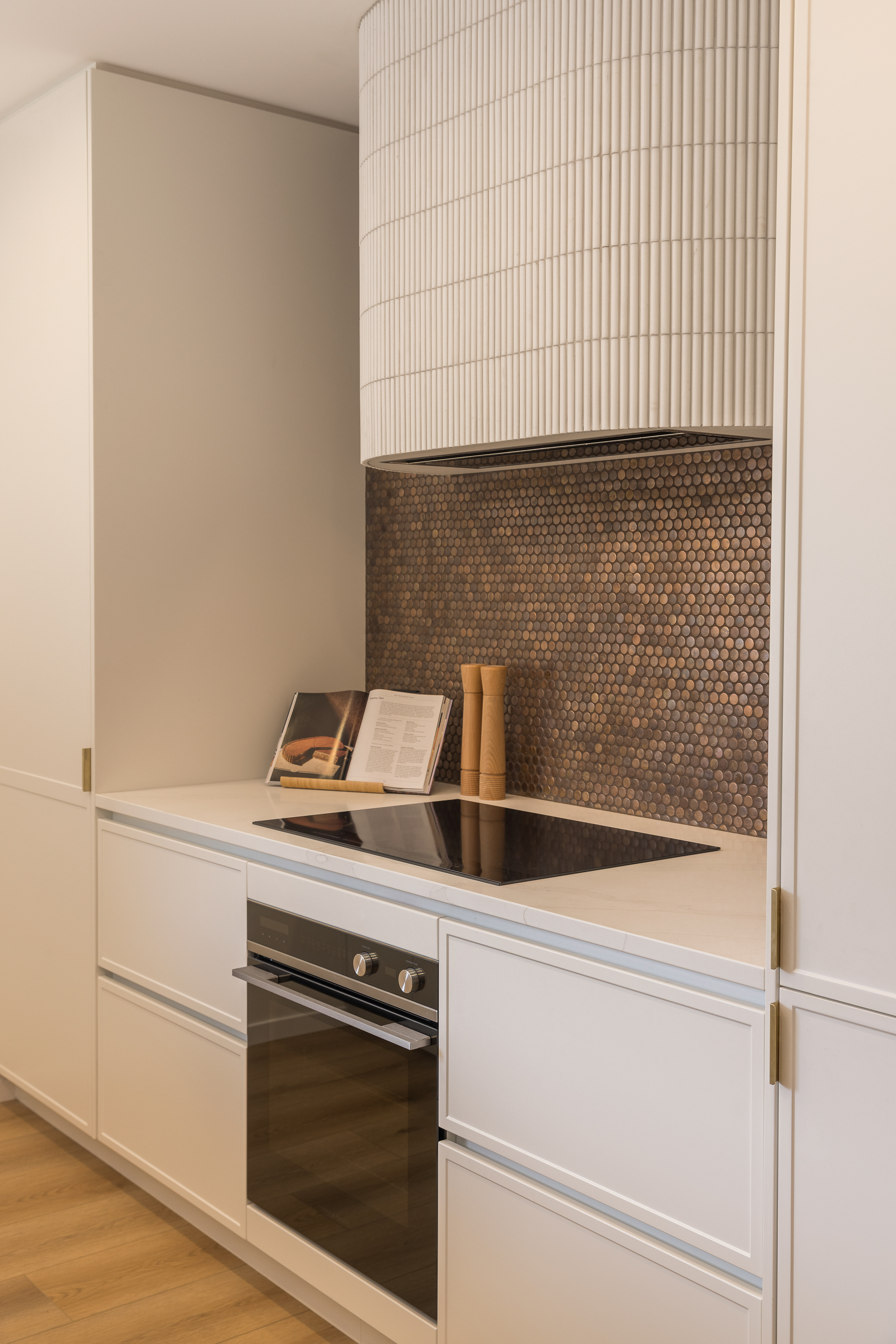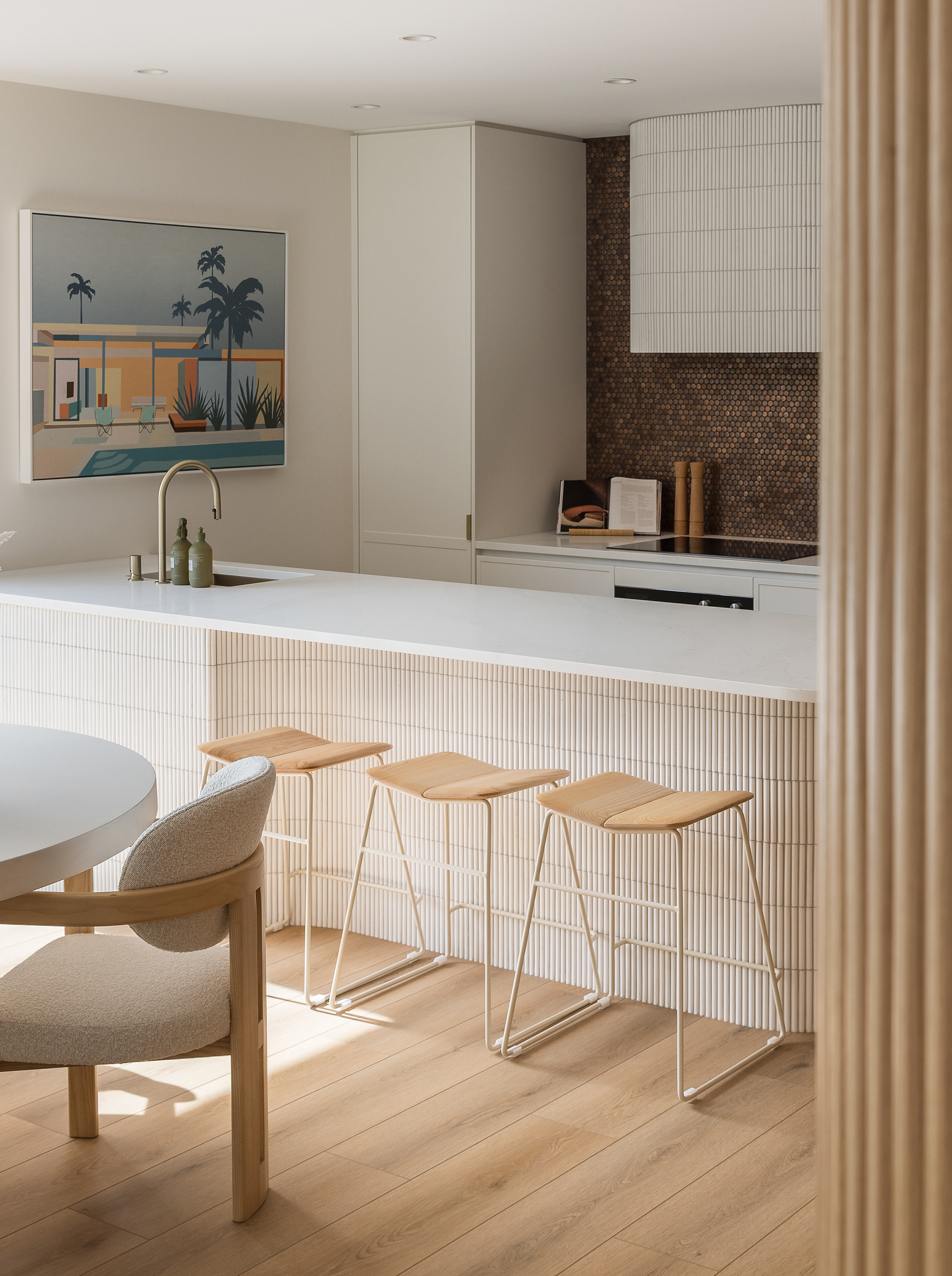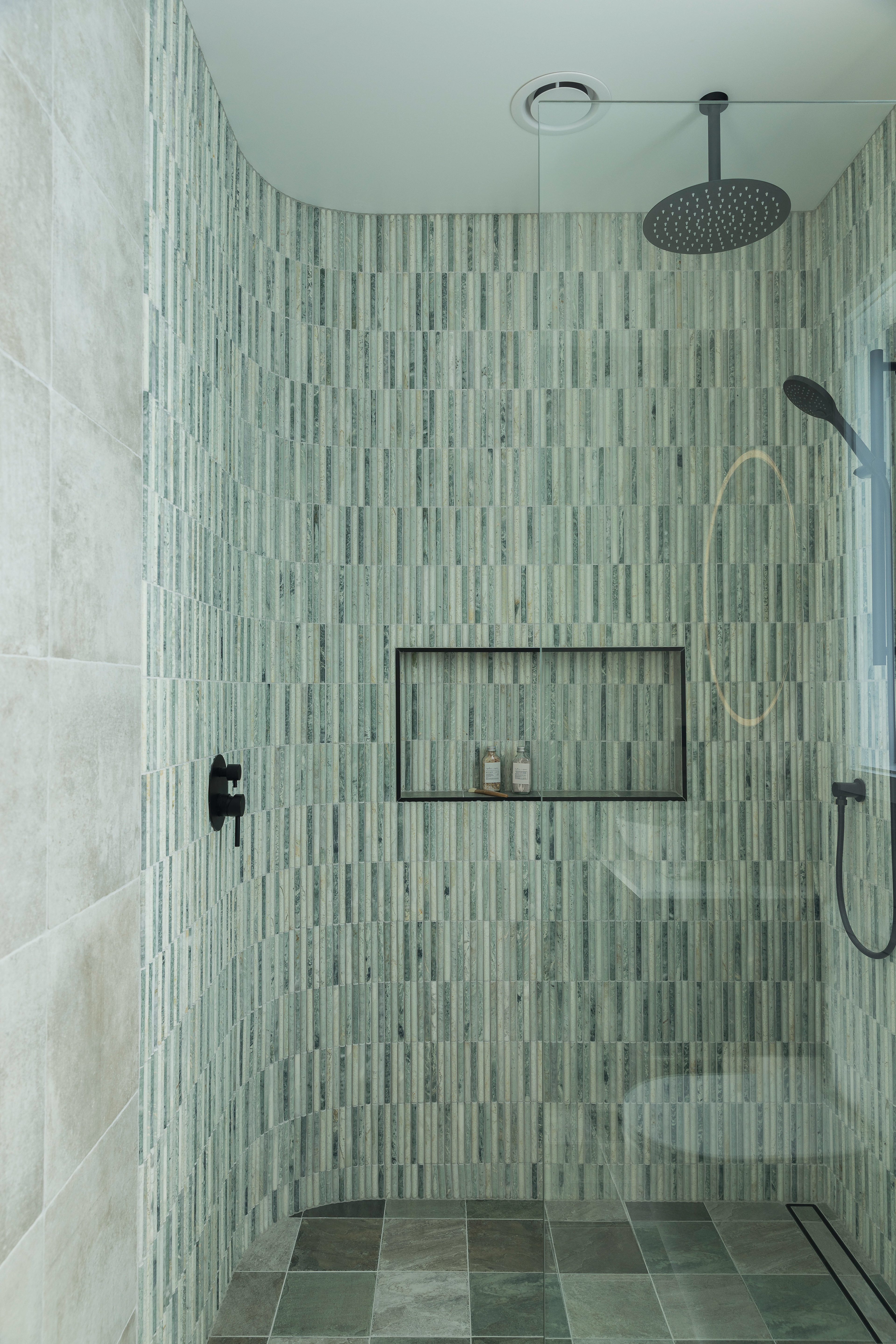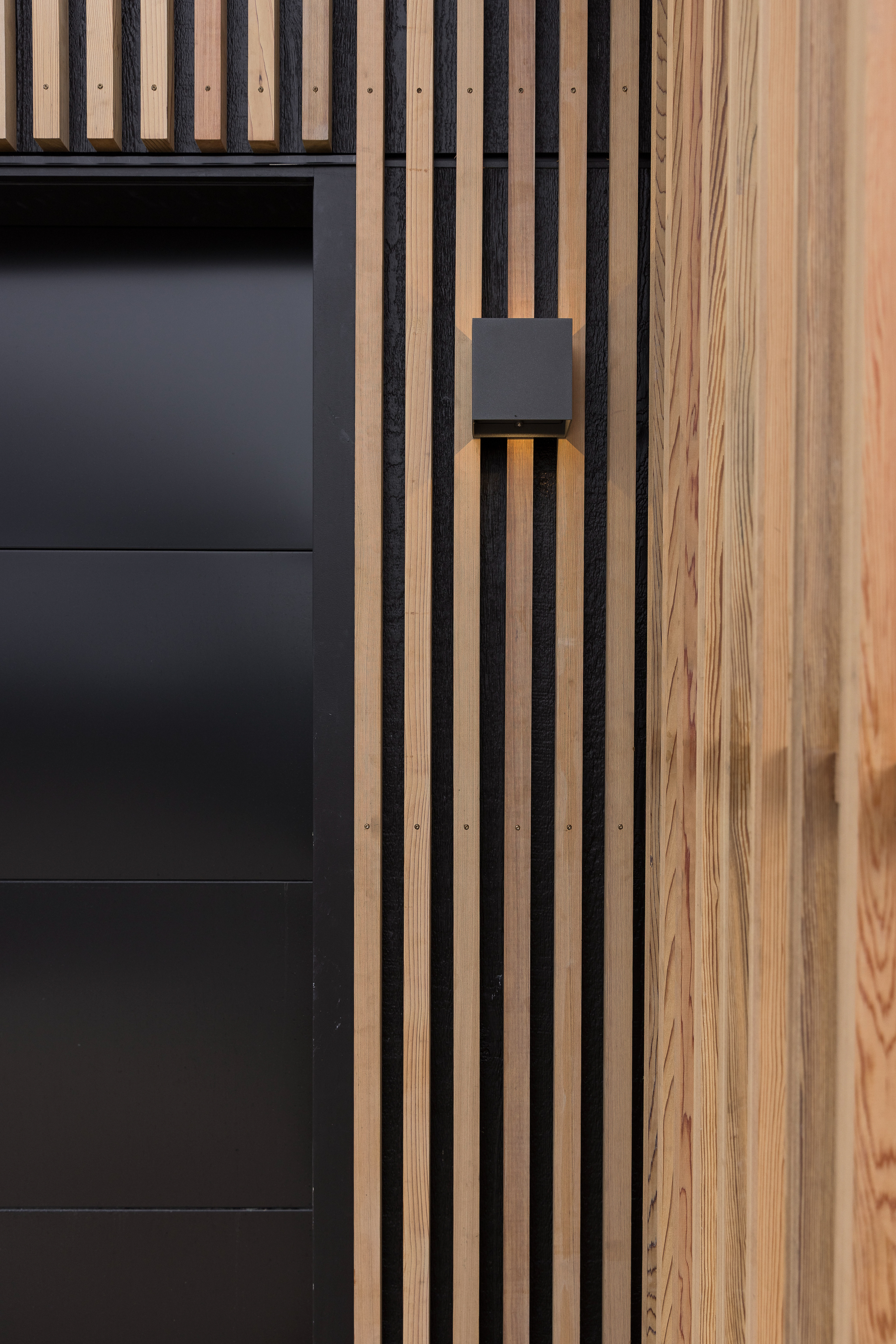 This home, located in Warkworth, blends modern design with thoughtful use of texture and shadows. The exterior pairs sleek, black cladding with warm vertical timber, playing with texture and shadows to engage in visual interest. Clean, angular lines meet soft, rounded corners, adding both structure and warmth. The entrance features a gentle curve, creating a welcoming transition from the outside in. This subtle detail sets the tone for the rest of the space, balancing clean, modern design with a softer, more organic touch. Timber feature walls inside the home bring the outdoors in, creating a flow between the inside and out. Multiple openings and spaces are designed to emphasise indoor-outdoor living, offering easy access to the surrounding nature.